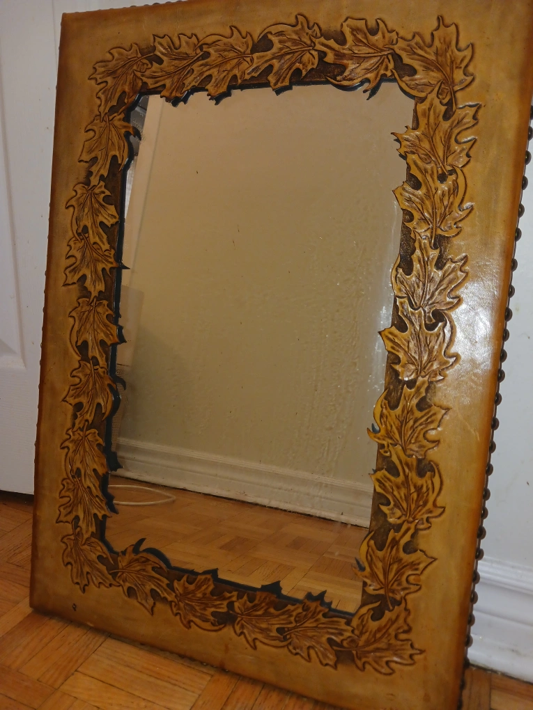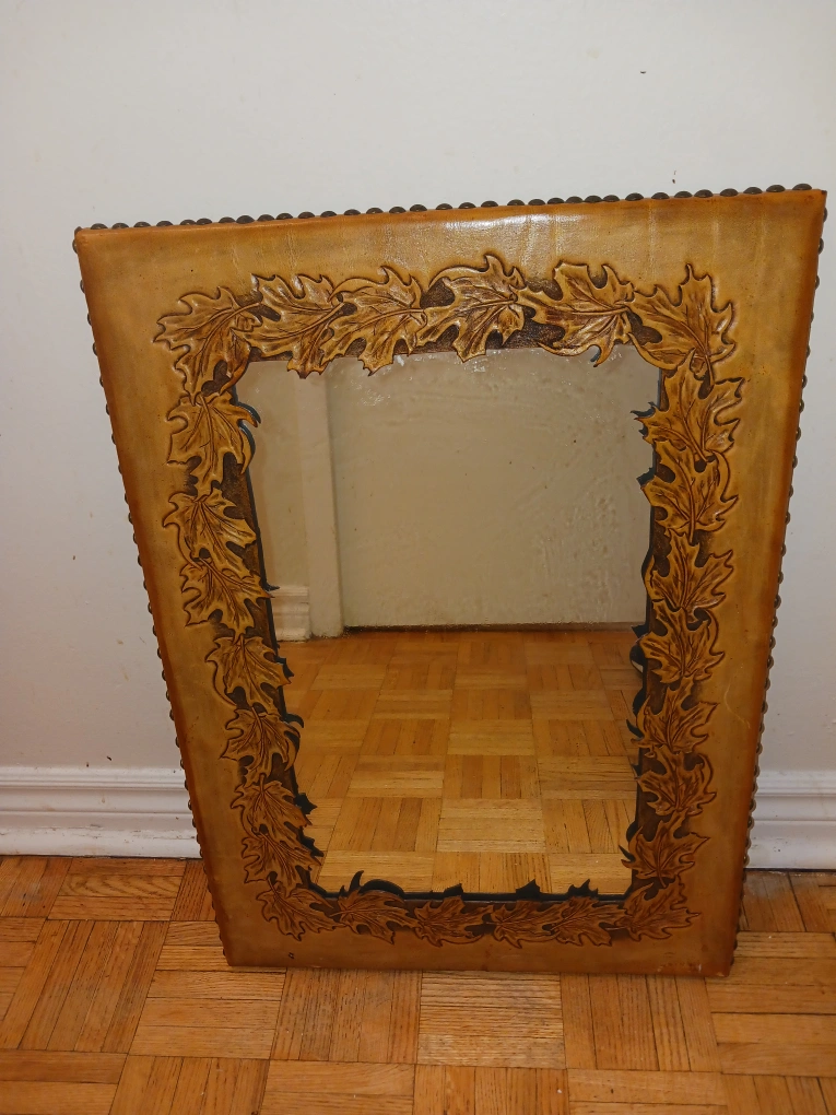 Unique mirror with a beautiful leather frame featuring an embossed leaf design. It's in great condition and would add a touch of rustic charm to any room. The frame is a warm tan colour.