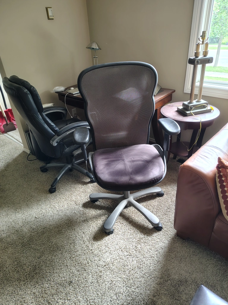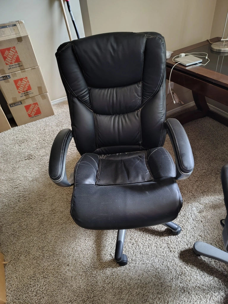 Selling used office chair in black. It's still in good condition and perfect for your home office setup. it is leather with padding high back with casters