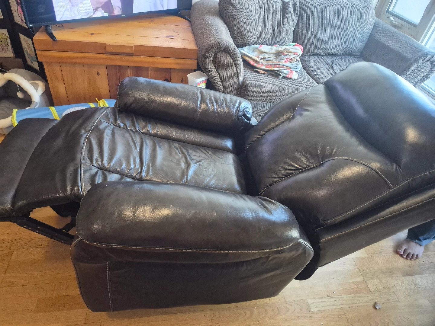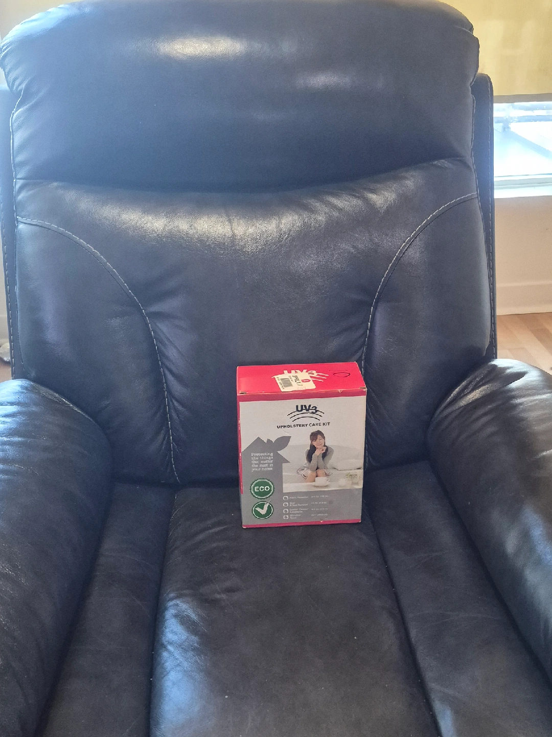 Selling a leather recliner chair in good condition. It comes with a UV3 Upholstery Care Kit, which includes: - Fabric Protection (24 fl. oz / 709 ml) - Stain & Spot Remover (4 fl. oz / 118 ml) - Leather Cleaner/Conditioner (16 fl. oz / 473 ml) - Microfiber Towel (12x12 / 30x30 cm)