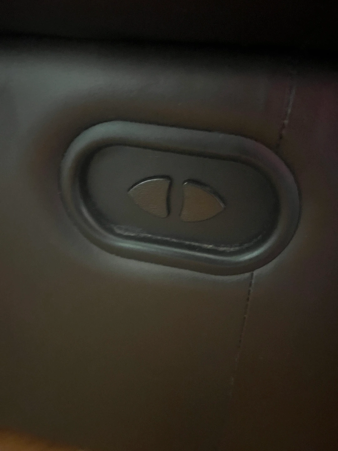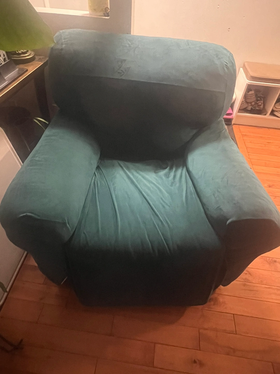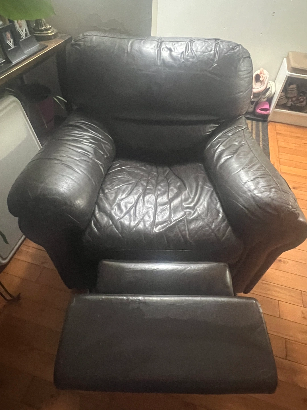 Black leather recliner with a footrest that extends with a button. It has a matching dark green slipcover. It reclines with a button on the side.