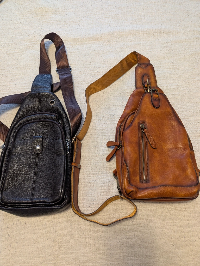 10Two leather sling bags for sale! One is a rich brown colour, and the other is black. Both are in great condition and ready for a new home. Perfect for carrying your essentials while keeping your hands free