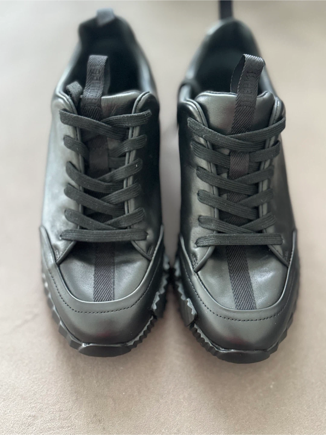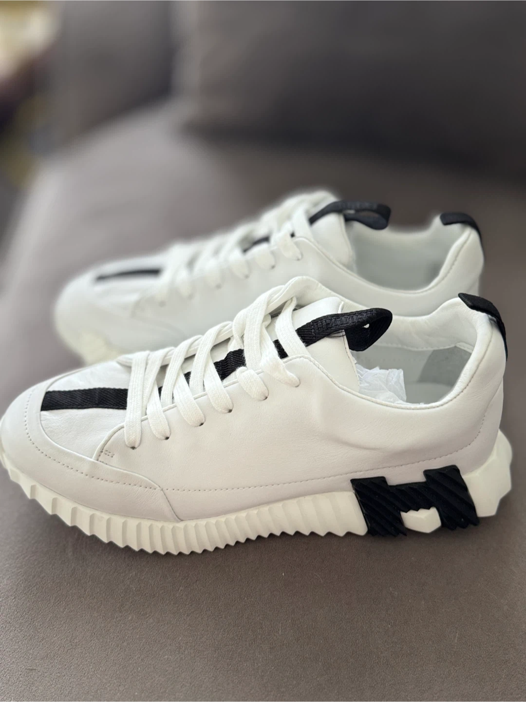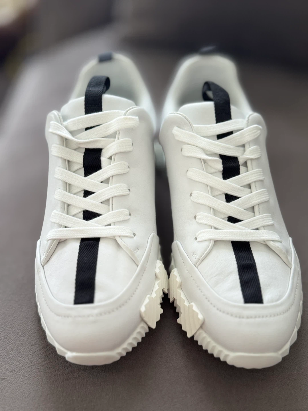 All leather Sneaker in calfskin and suede goatskin. Light sole with contrasting design for a versatile and modern look. $550 each Black Size 8.5-9.5 White Size 9-10