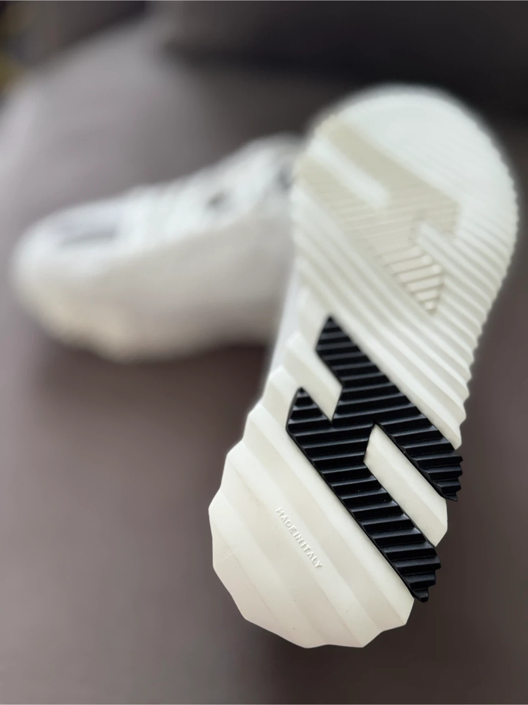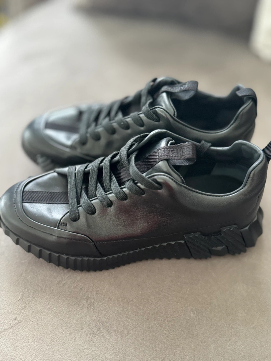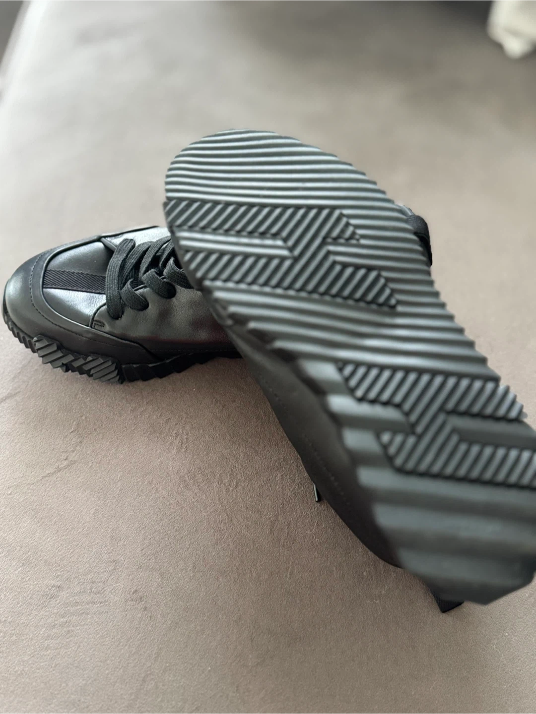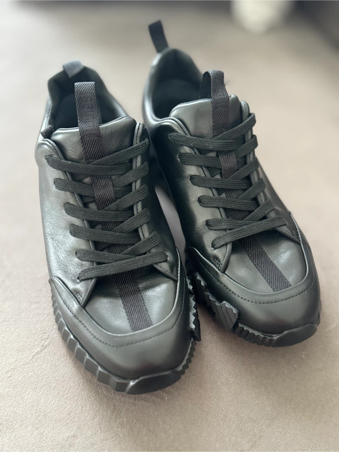 All leather Sneaker in calfskin and suede goatskin. Light sole with contrasting design for a versatile and modern look. $550 each Black Size 8.5-9.5 White Size 9-10