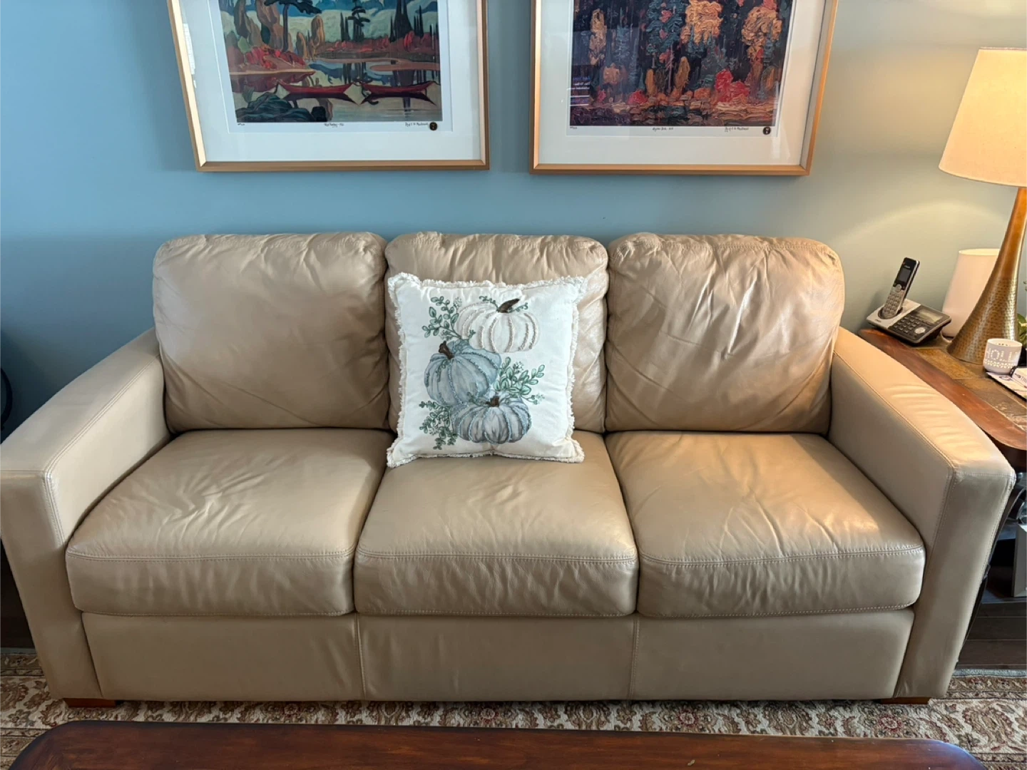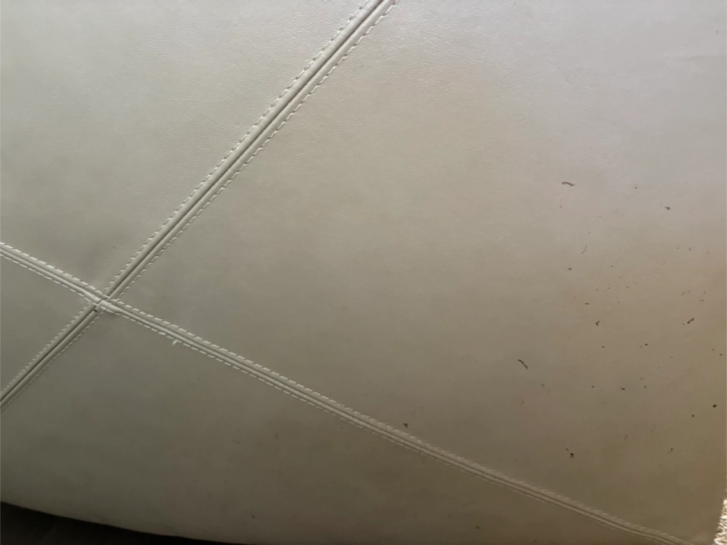 36Comfortable and stylish 3-seater sofa with genuine leather cushions and PVC sides/back. • Condition: Gently used, clean, no rips, tears or major stains. please see photos for details. Small scratches on side of sofa. Color: Neutral beige - easy to match with any décor. • Material: Genuine leather on seating surfaces, durable PVC on sides and back. • Dimensions: Length: 78 inches Width: 35 inches Height: 35 inches Perfect for a living room, den, or office. Non-smoking home. Asking price: $200