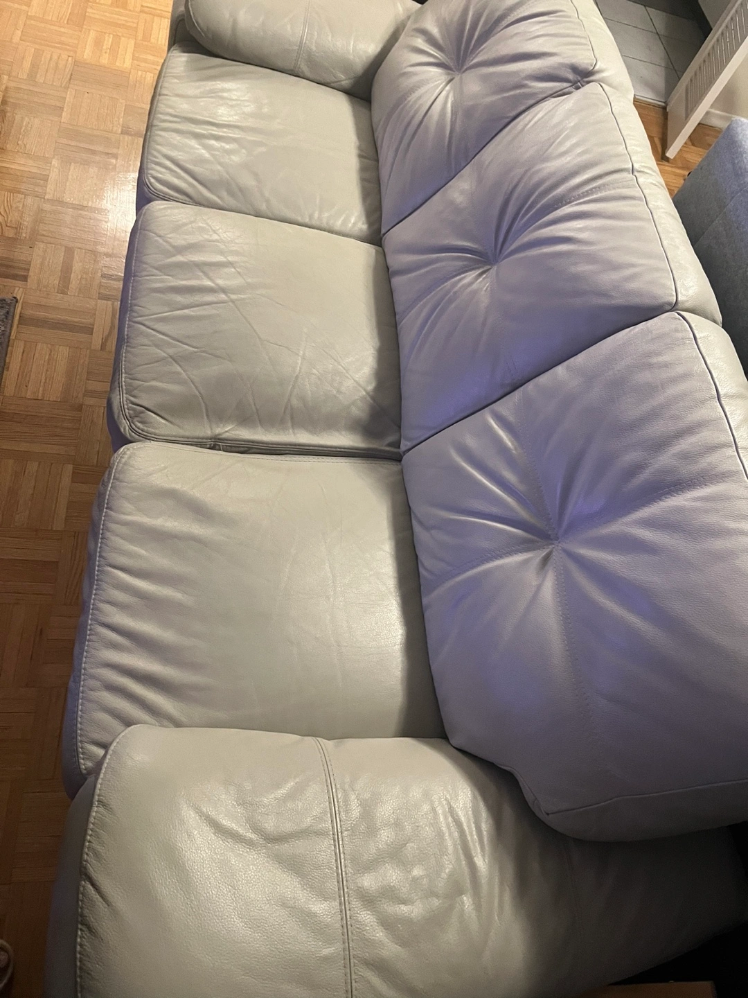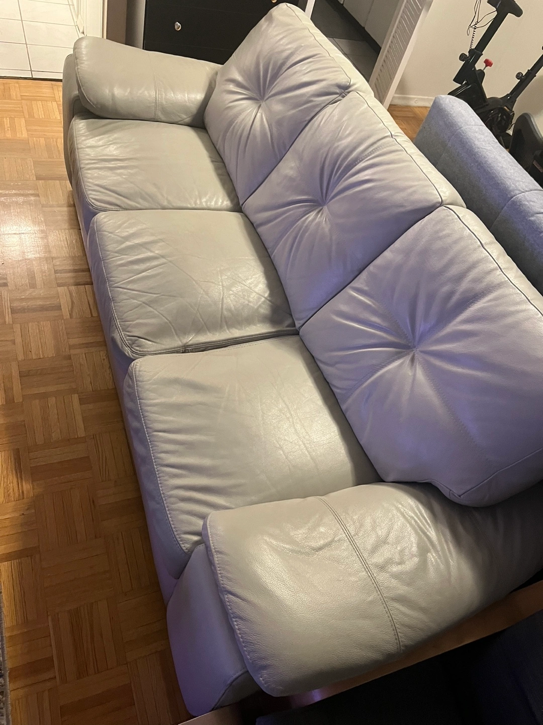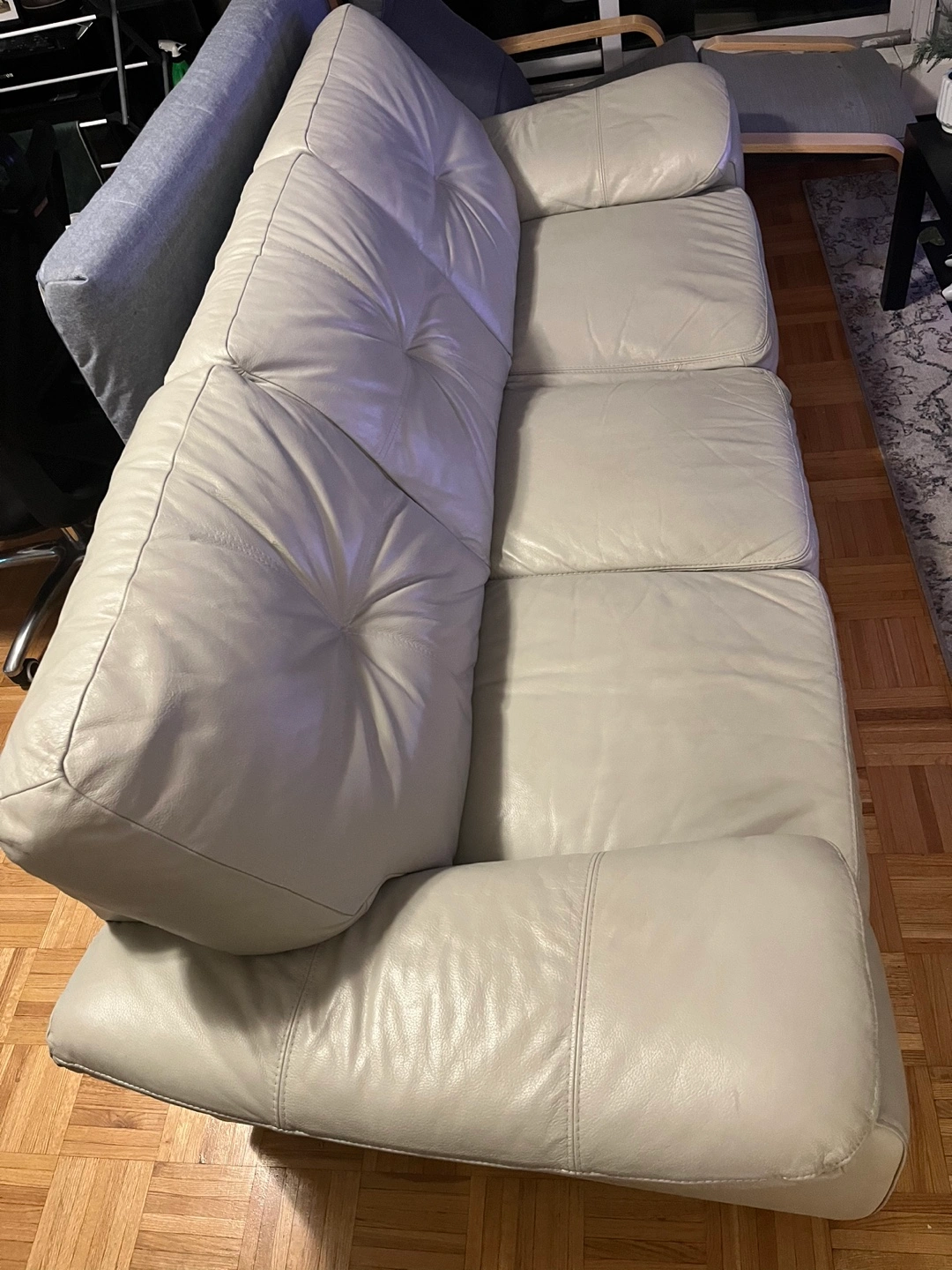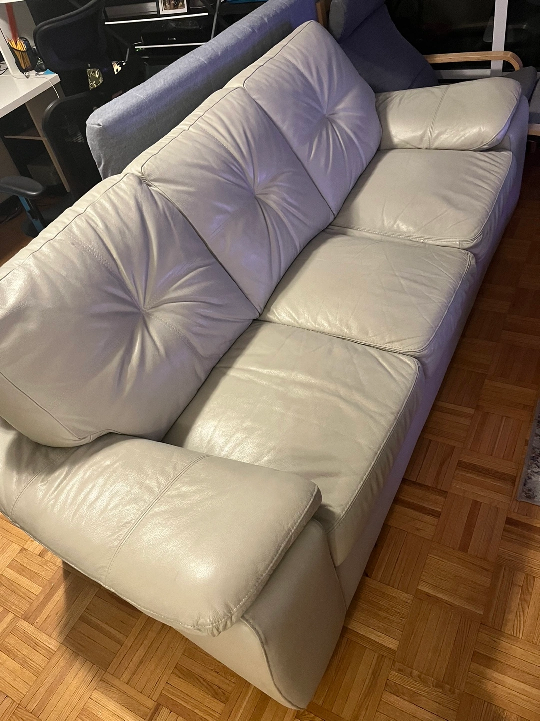 selling my beige leather couch in excellent condition. Originally bought for $1,800, but priced lower due to moving and needing it gone soon. Length is 87.5 inches Details: • Beige leather, clean and very comfortable • Doesn’t fit in the elevator, so it’ll need to be carried down stairs (priced lower to accommodate this) • Will need 2-3 people to move it • Pick up only Message for any more info.