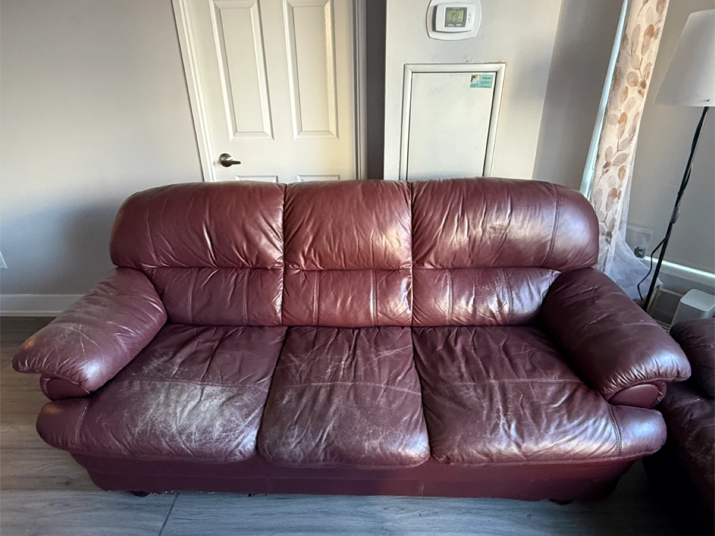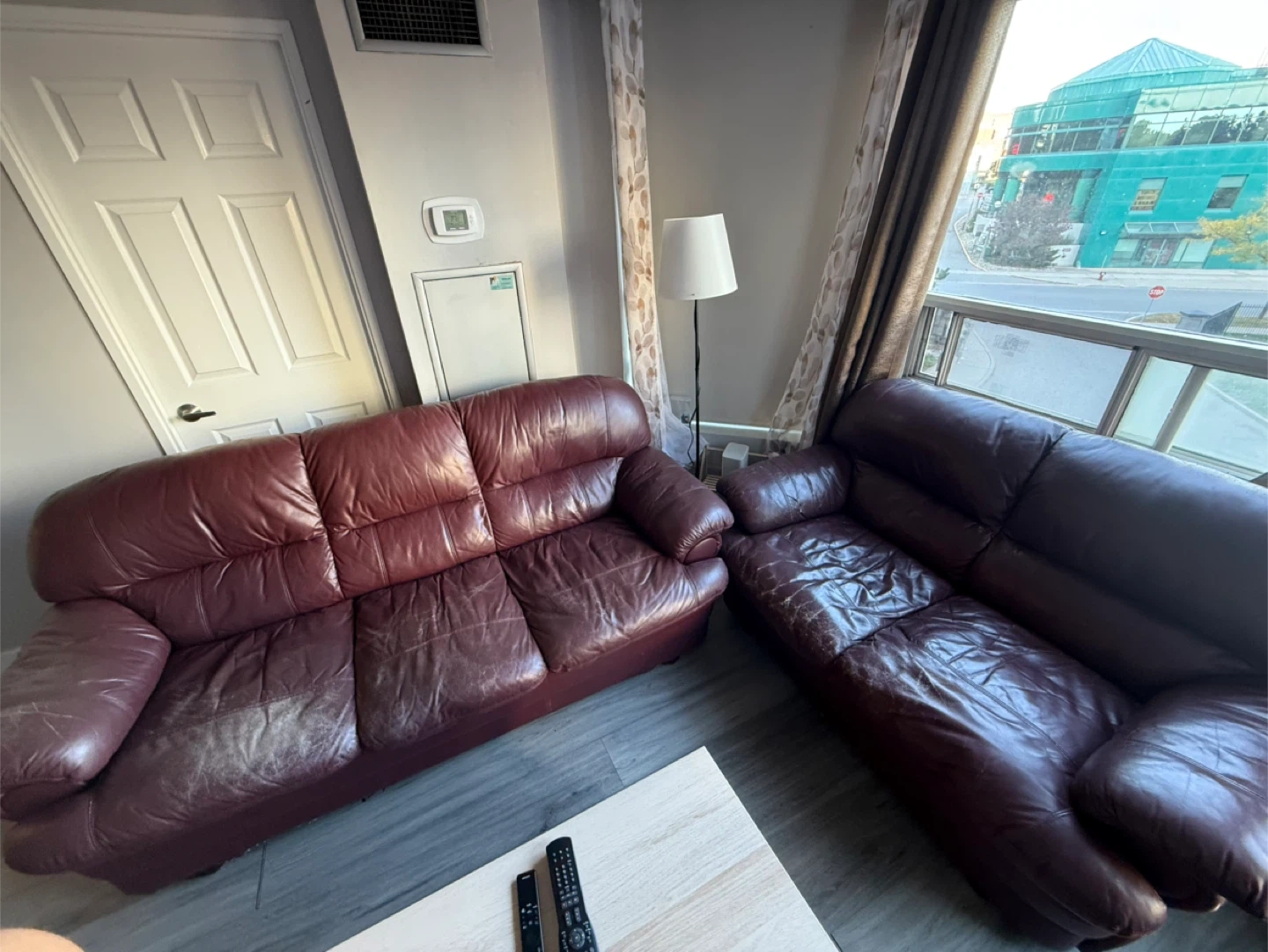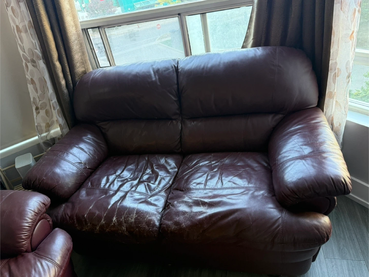 Selling a comfy leather sofa set which includes a 3-seater sofa and a loveseat. Both pieces show signs of wear, but still have lots of life left in them. Perfect for a living room or rec room! ✅ No rips, tears, or major scratches ✅ Cushions are firm and supportive ✅ Easy to clean and durable leather ✅ Smoke-free, pet-free home ✅ Seats 5 people comfortably 📍 Pickup: L5R 1Y2