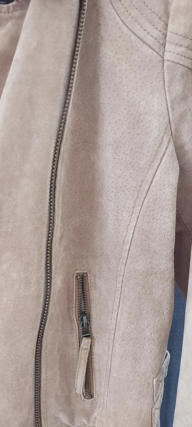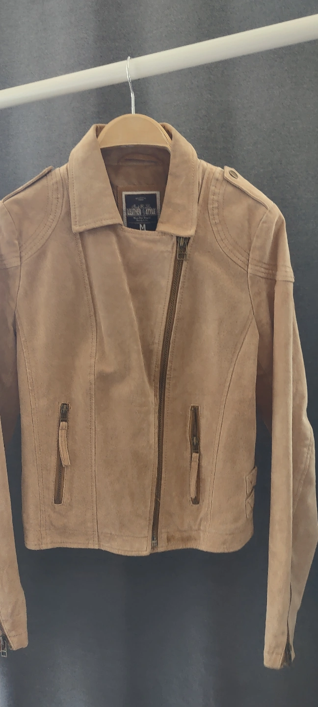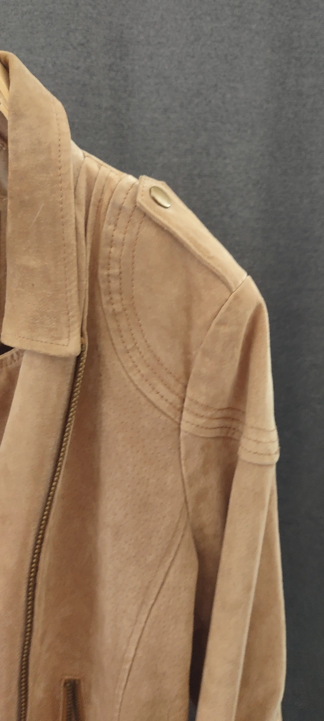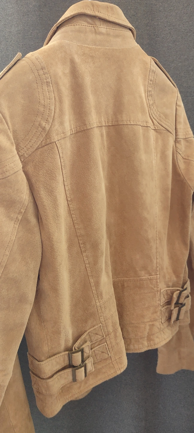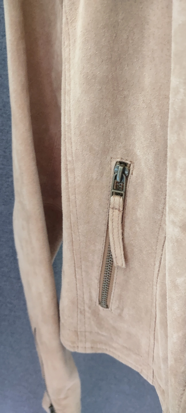 1000+Women's beige suede jacket. Size medium. Features a zip front closure, two zippered pockets, and shoulder detailing. Genuine Style since 1998.