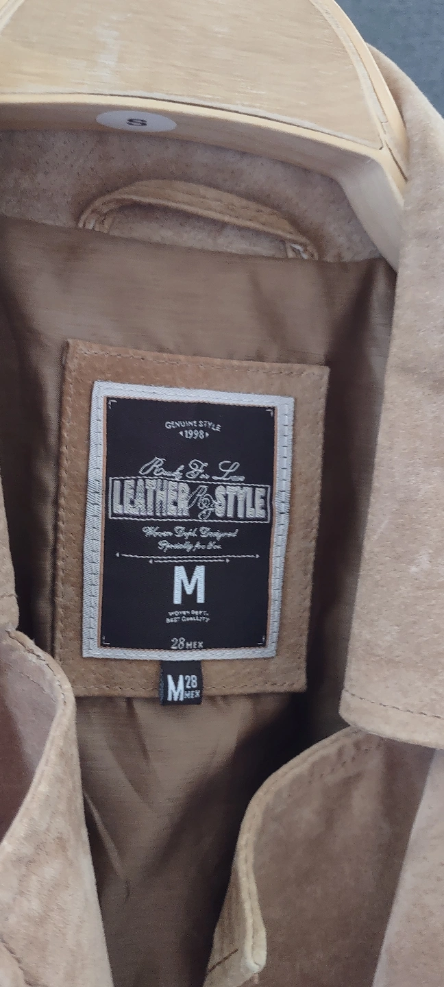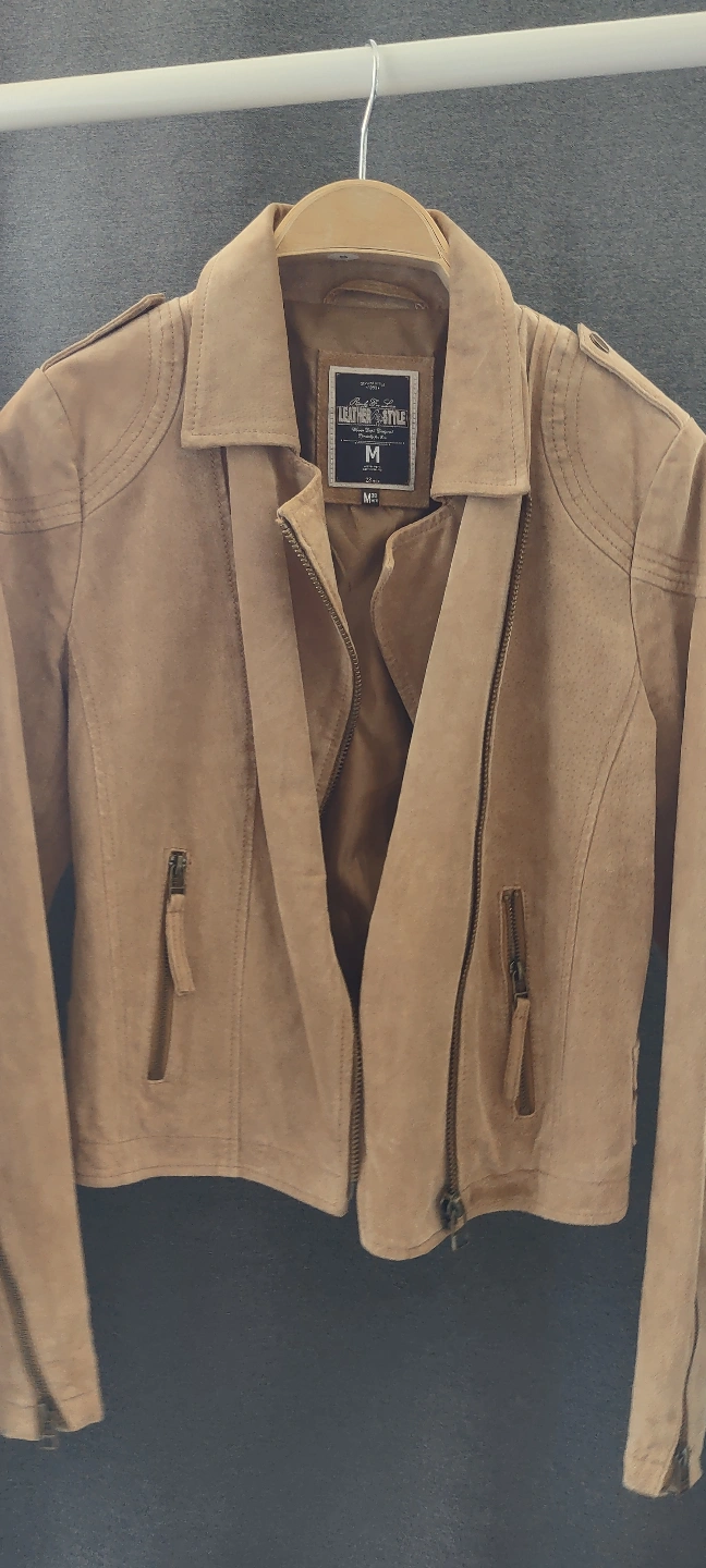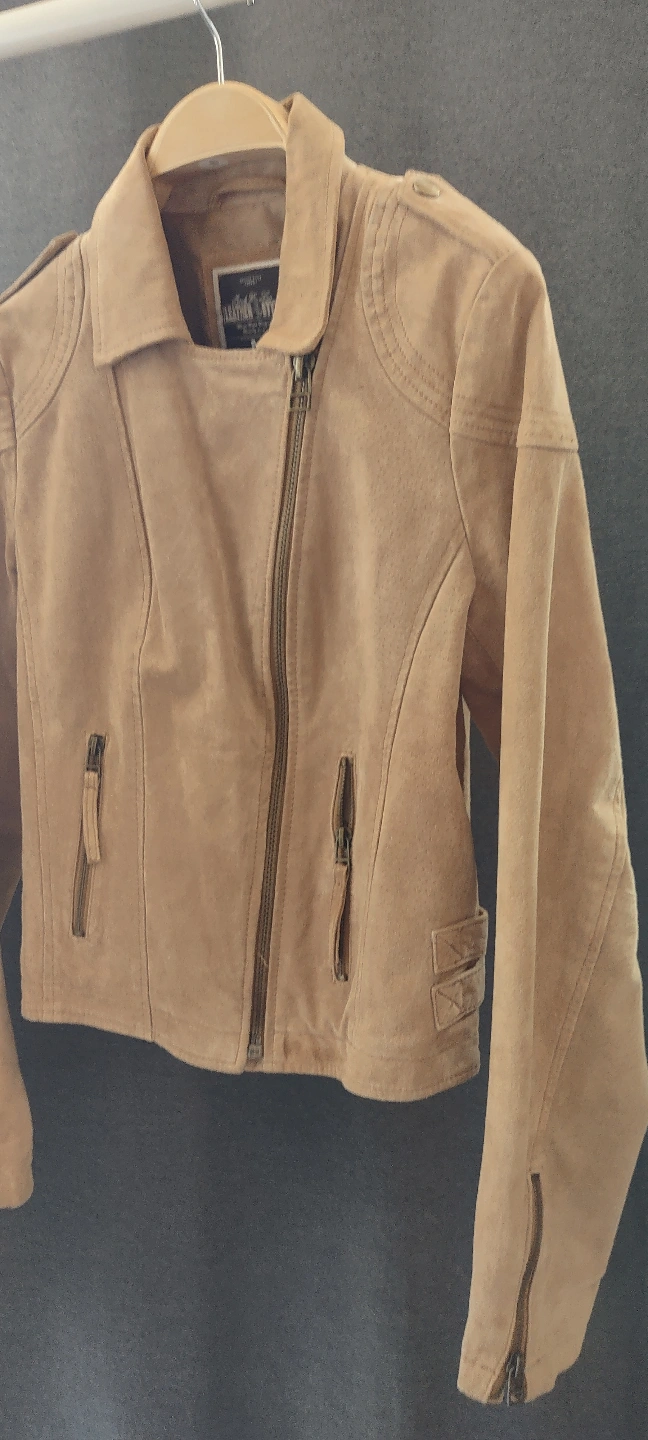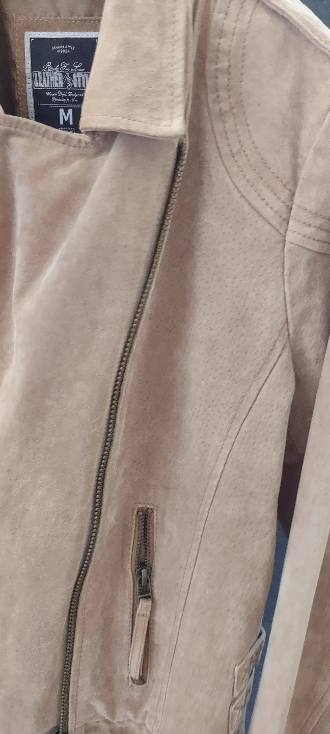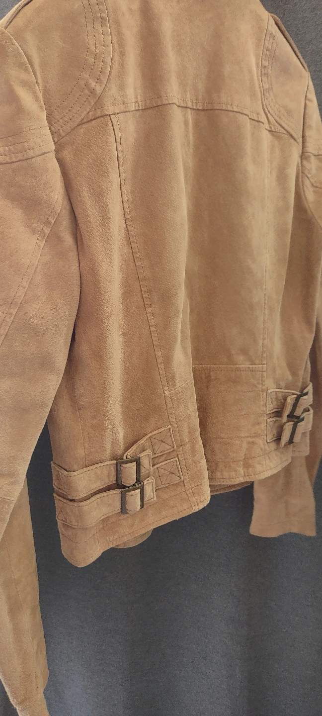 1000+Women's beige suede jacket. Size medium. Features a zip front closure, two zippered pockets, and shoulder detailing. Genuine Style since 1998.