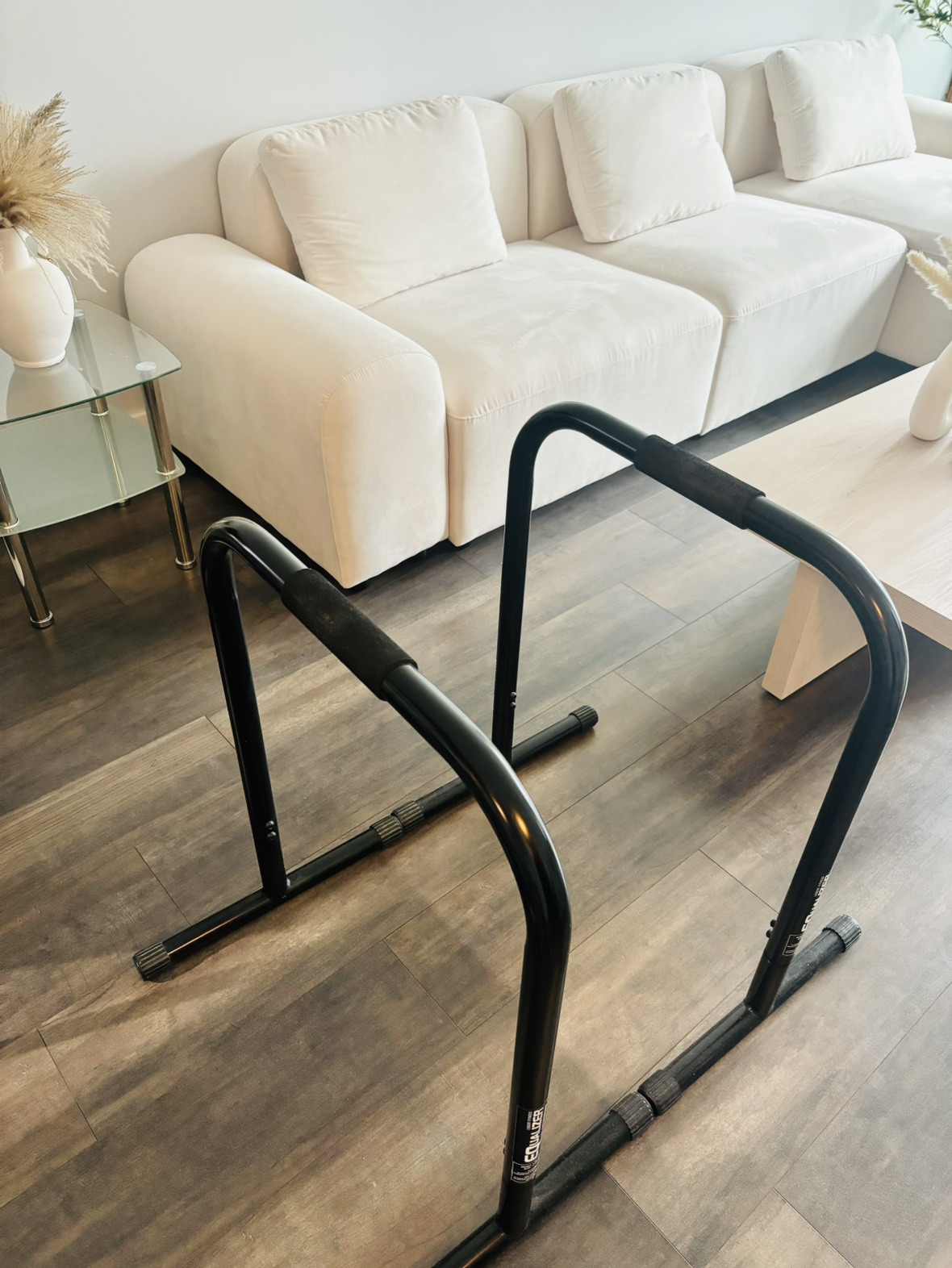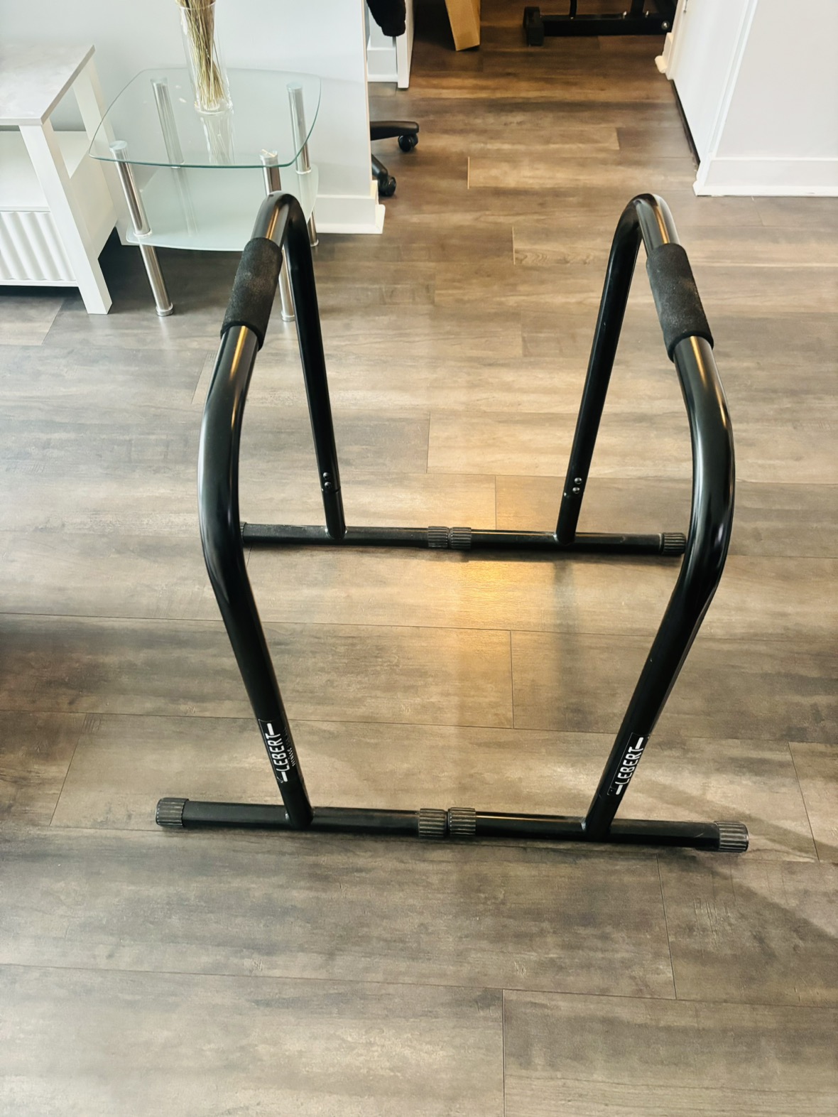 39Two (2) EQualizer XL bars with durable foam handles. Full Body Workout - This high-quality functional fitness dip stand station with stabilizing challenger bars is perfect for full body bodyweight resistance exercises such as dips, push and pull ups, L-sits, knee and leg raises, stretches and more.