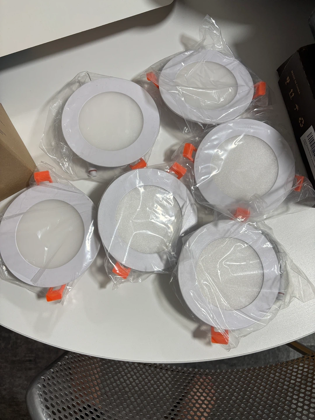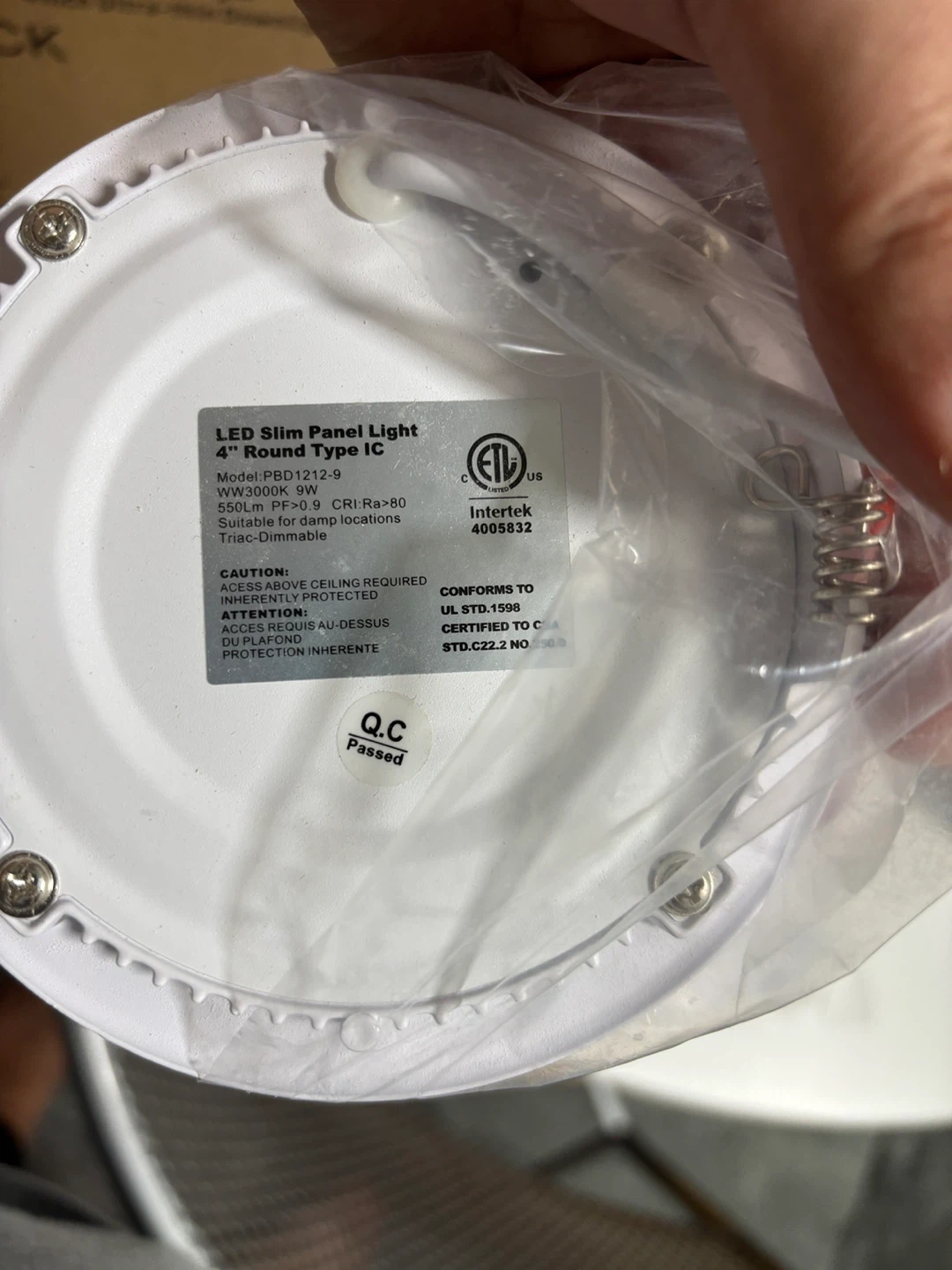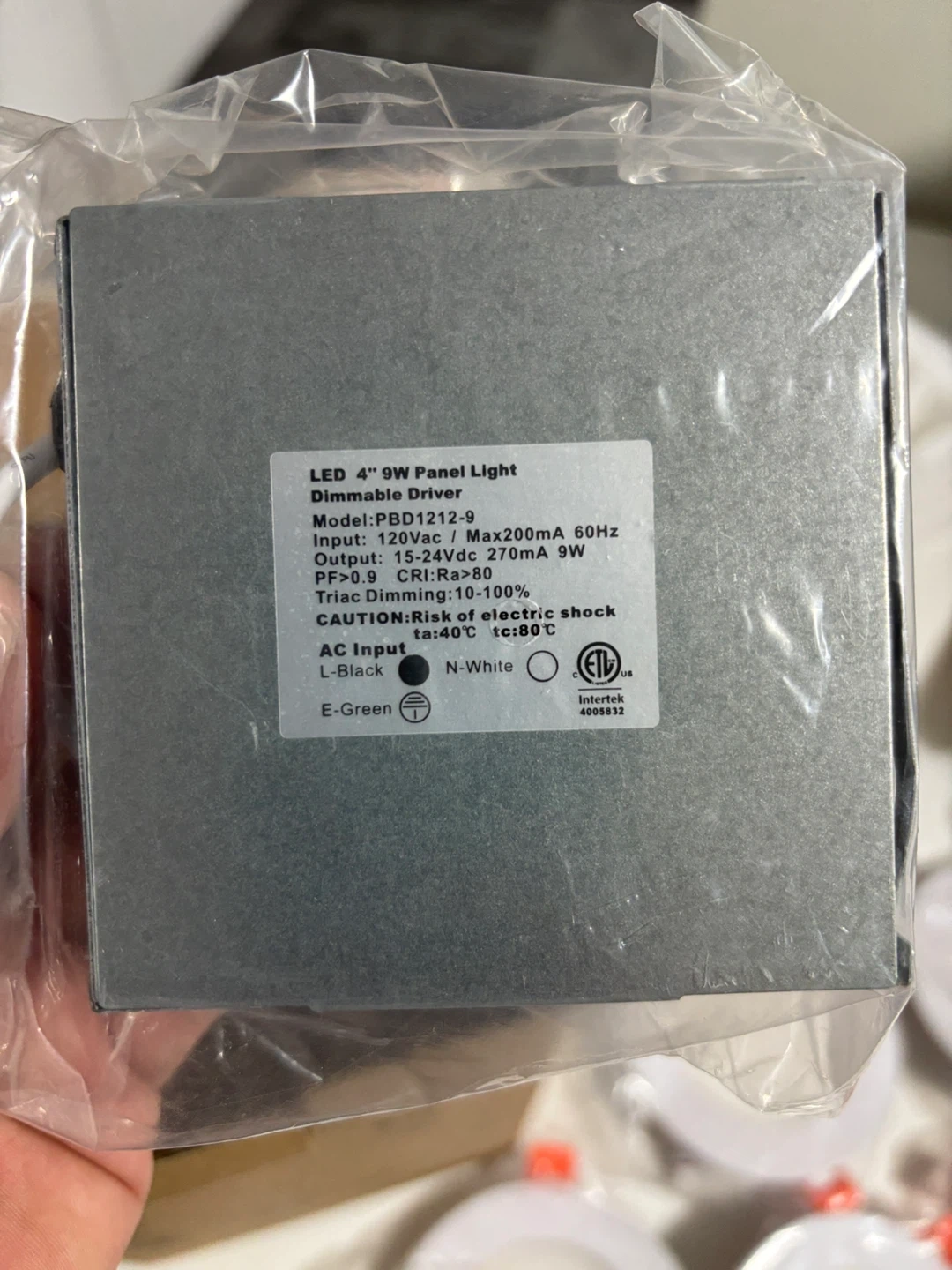 Selling six LED 4" 9W Panel Lights. These are dimmable and come with the driver. Colour temperature is 3000. I switched to 5000 as I prefer white light. These are used but look new. The drivers for each are brand new never used as I used the pre installed and the work interchangeably - Model: PBD1212-9 - Input: 120Vac / Max200mA 60Hz - Output: 15-24Vdc 270mA 9W - PF:0.9 CRI:Ra>80 - Triac Dimming: 10-100%