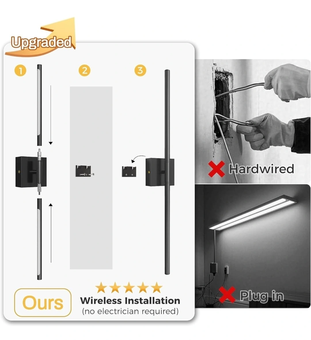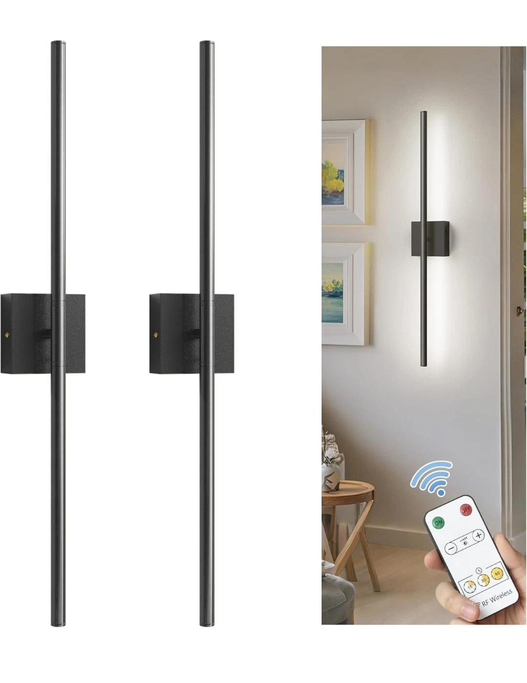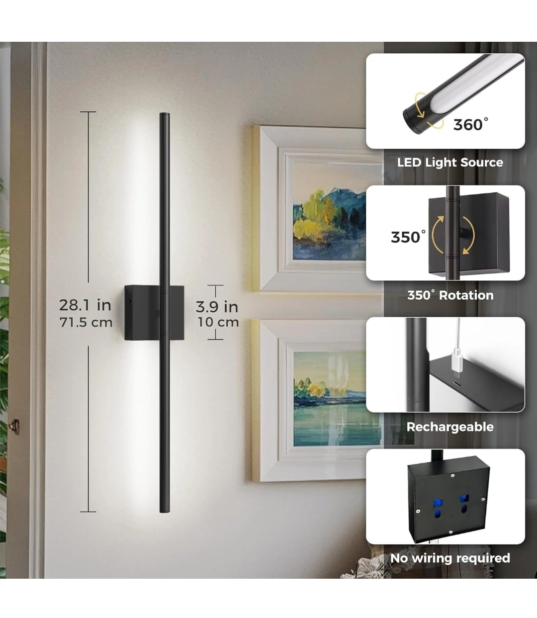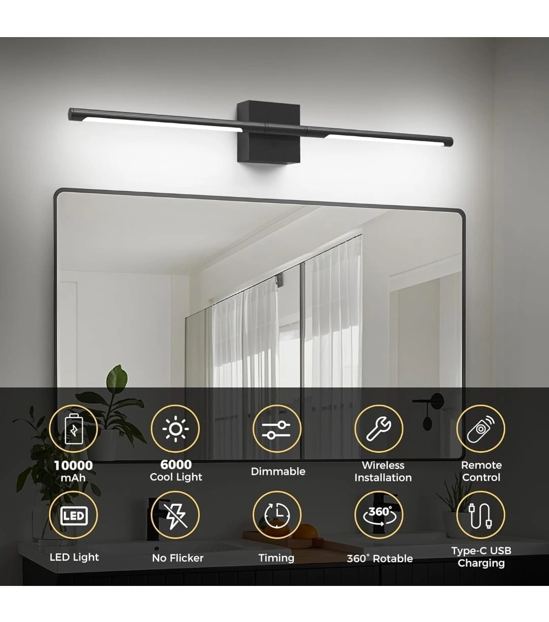 This LED vanity light fixture is perfect for adding a modern touch to your bathroom or vanity area! Key features: - Dimmable with 6000K cool light - Rechargeable with a 10000 mAh battery - Wireless installation (no electrician required) - 360° rotatable - Remote control included - Type-C USB charging The fixture measures 28.1 inches (71.5 cm) in height and 3.9 inches (10 cm) in depth. Comes with the original box and a USB charging cable