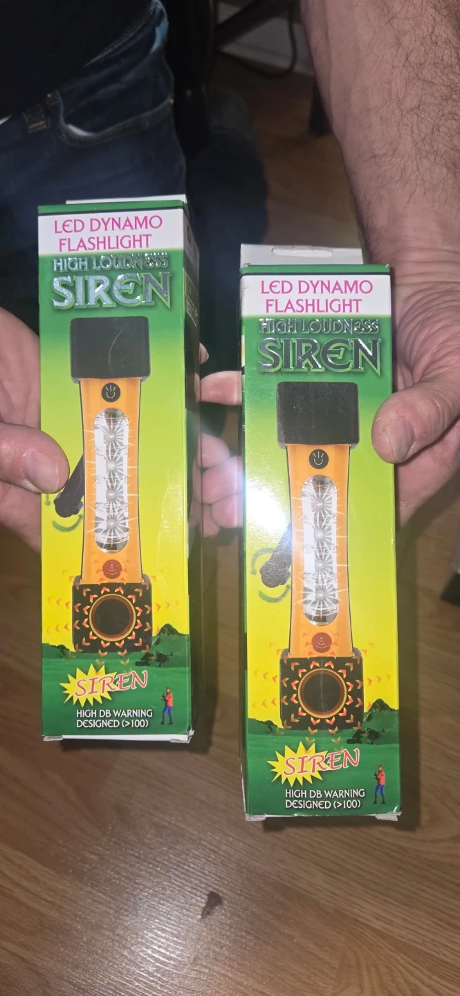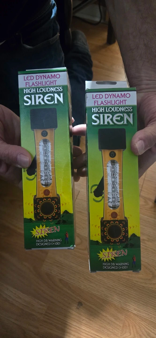84Selling a brand new LED dynamo flashlight with a high-loudness siren. It's still in its original box and ready to go! The flashlight features a high dB warning (>100). Perfect for emergencies or outdoor activities