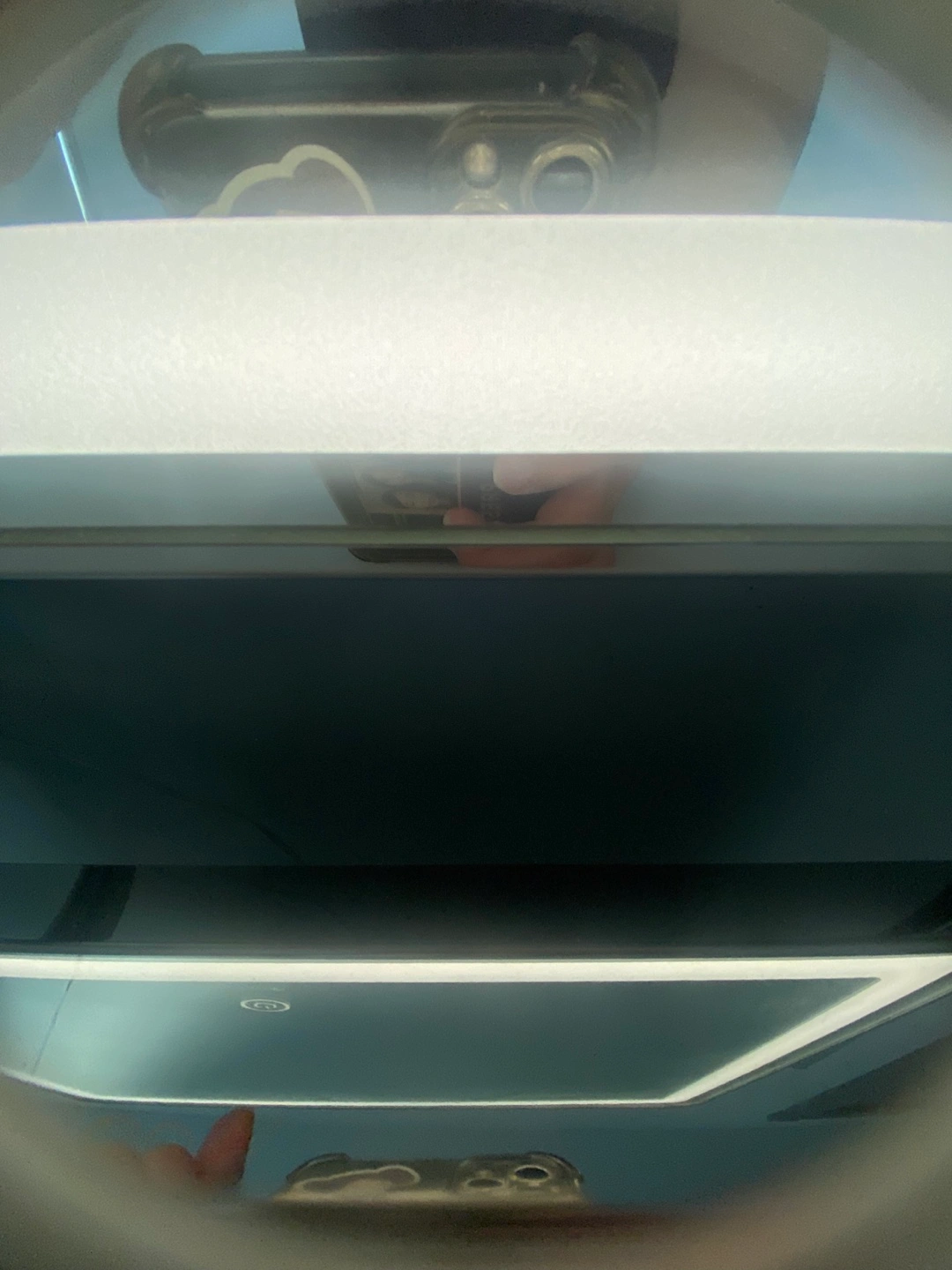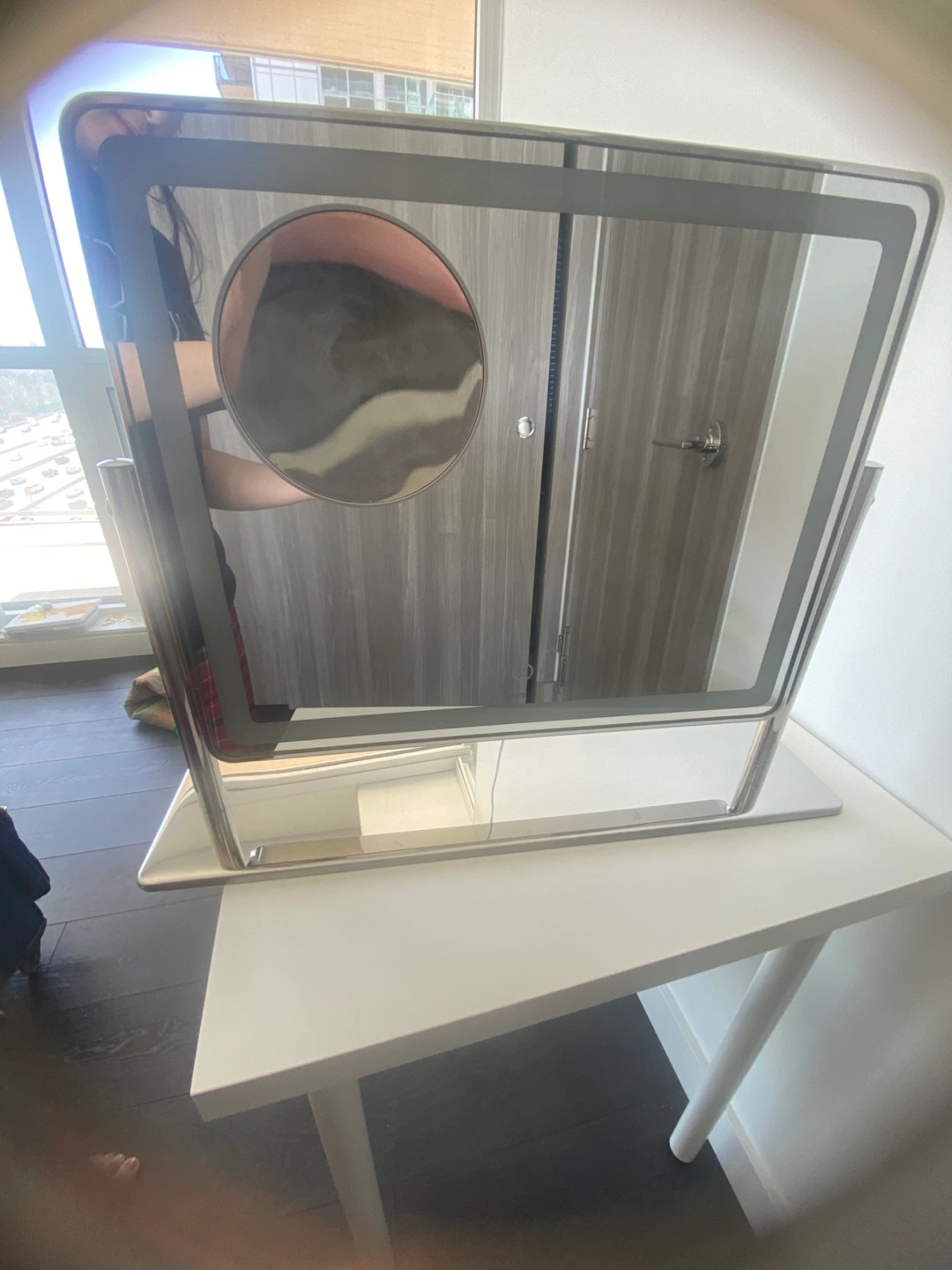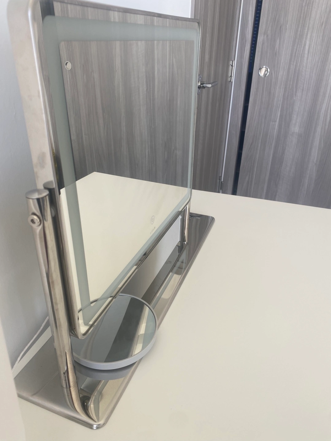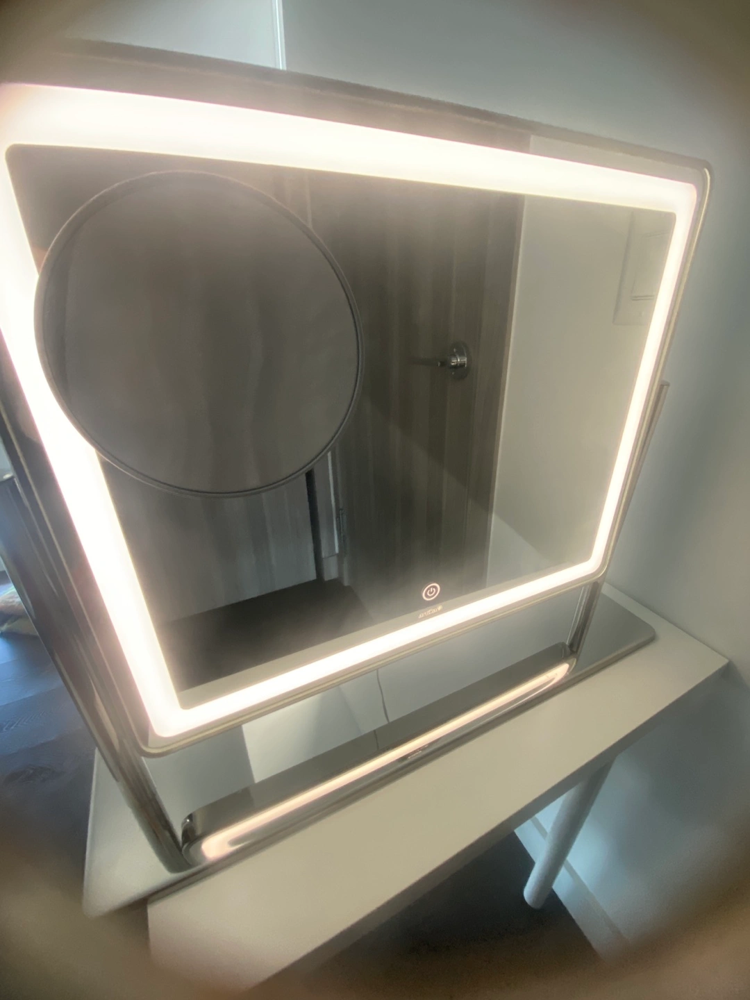 49Stylish vanity mirror. Features LED lighting and a detachable magnifying mirror. Modern design, great for makeup application. Includes a box
