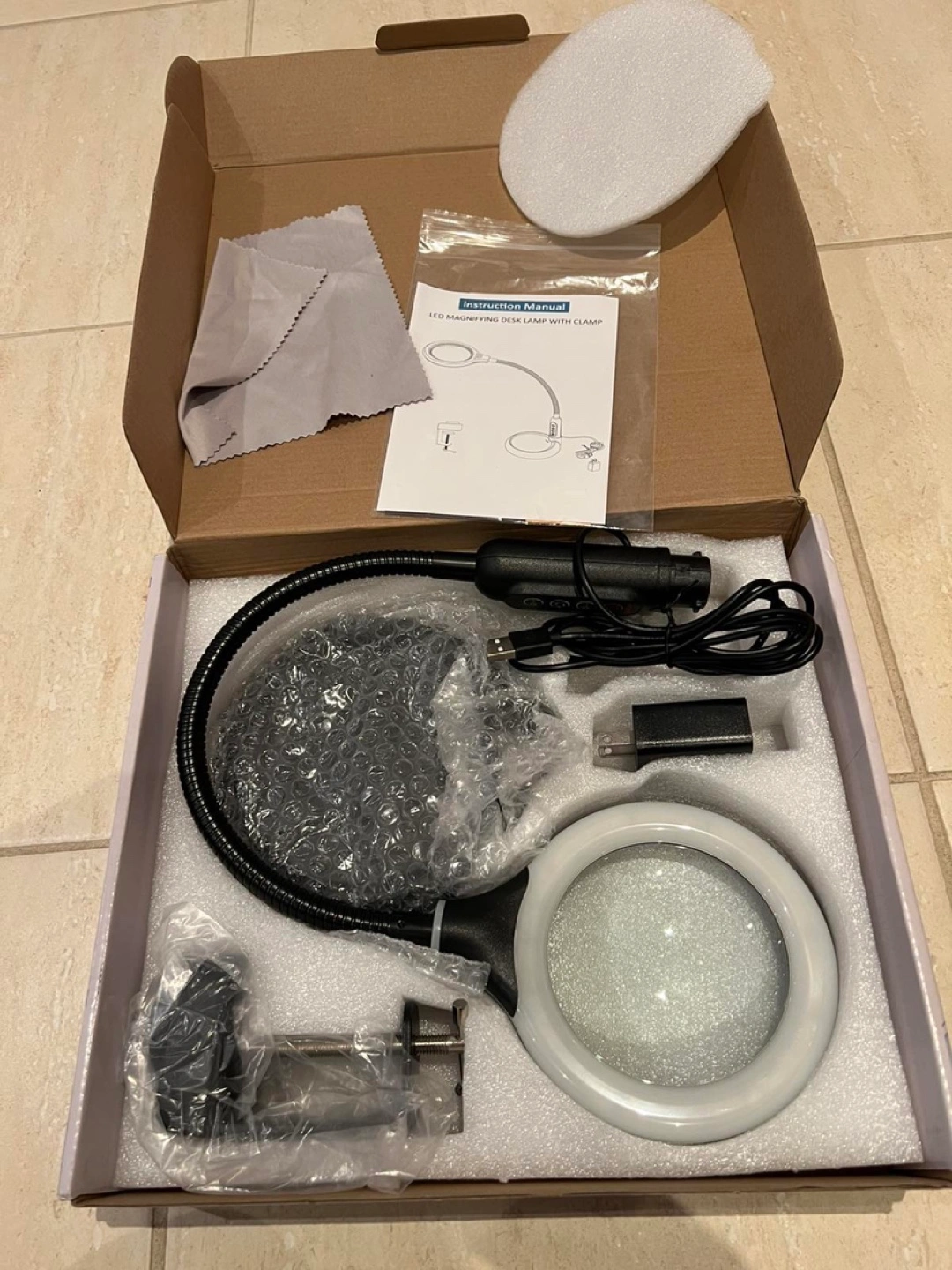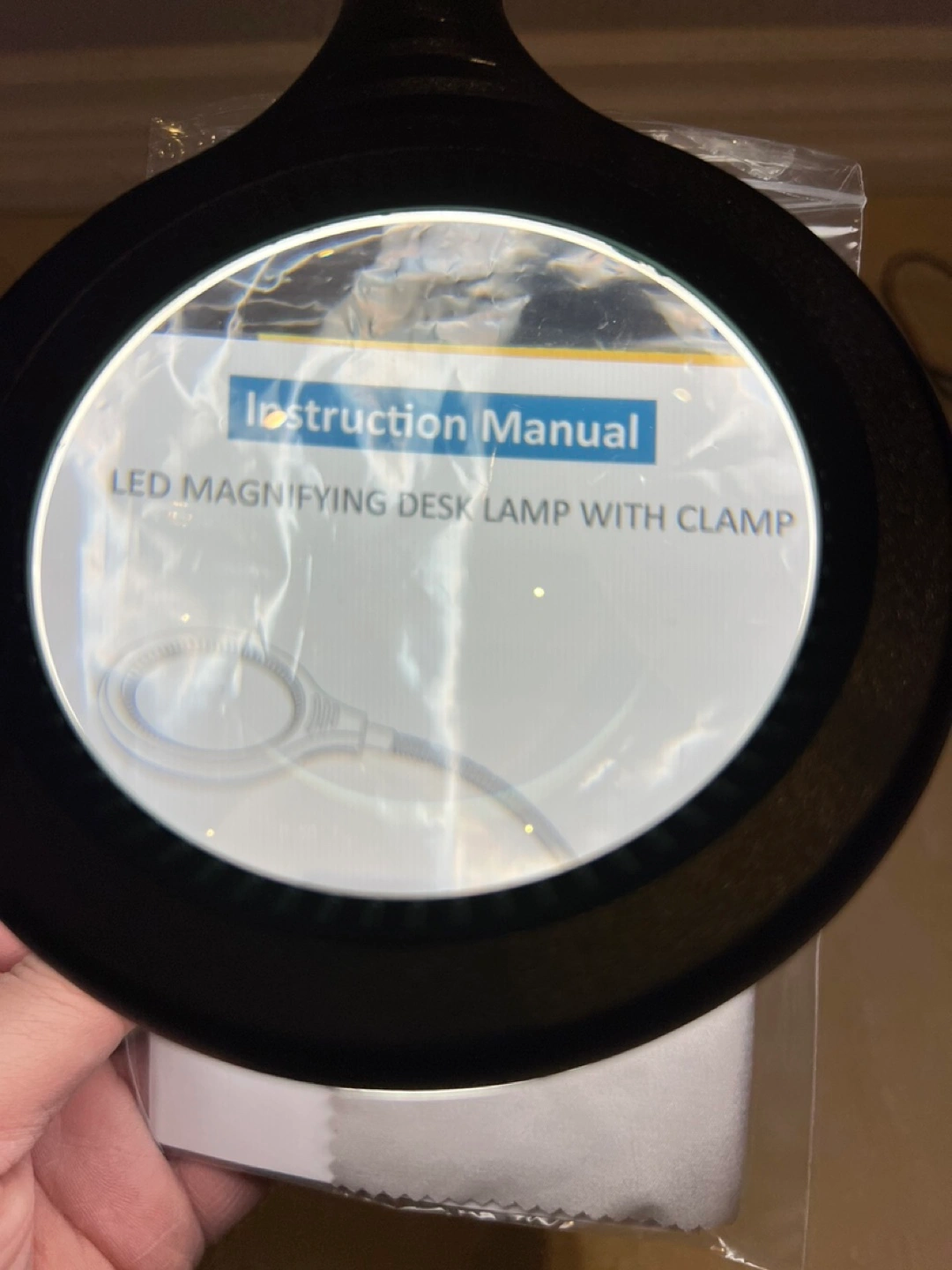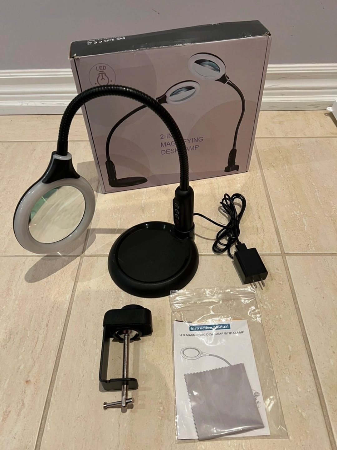 1892-in-1 magnifying desk lamp. Features a flexible gooseneck and a clamp for versatile placement. Includes a power adapter and cleaning cloth. LED light for illumination.