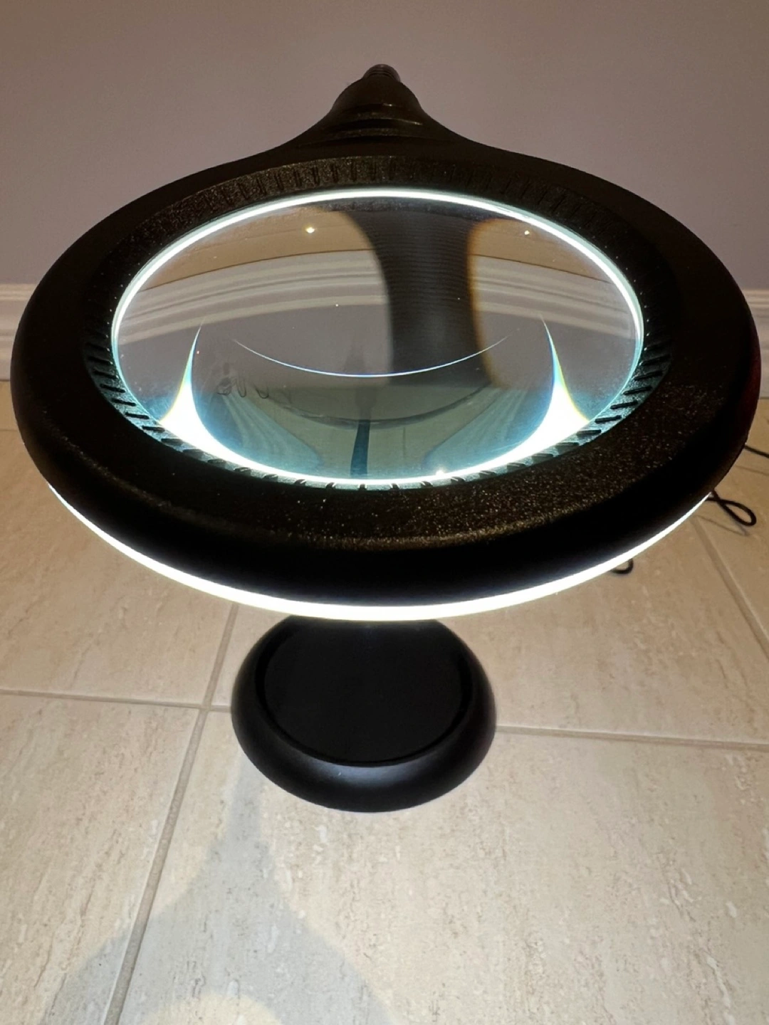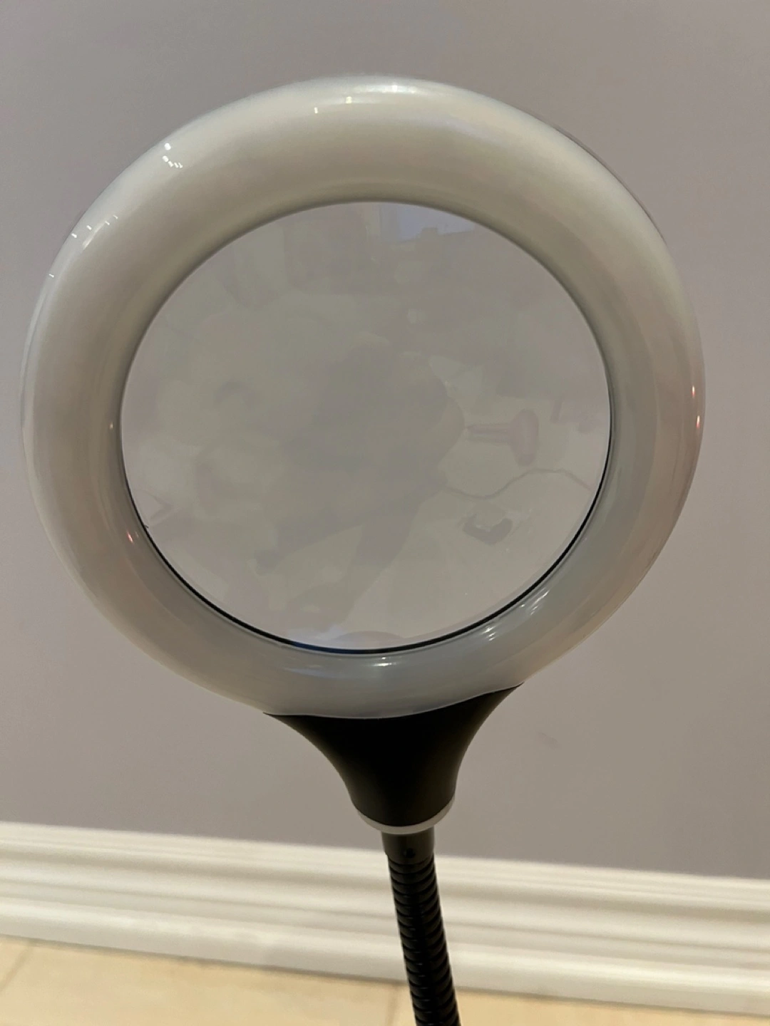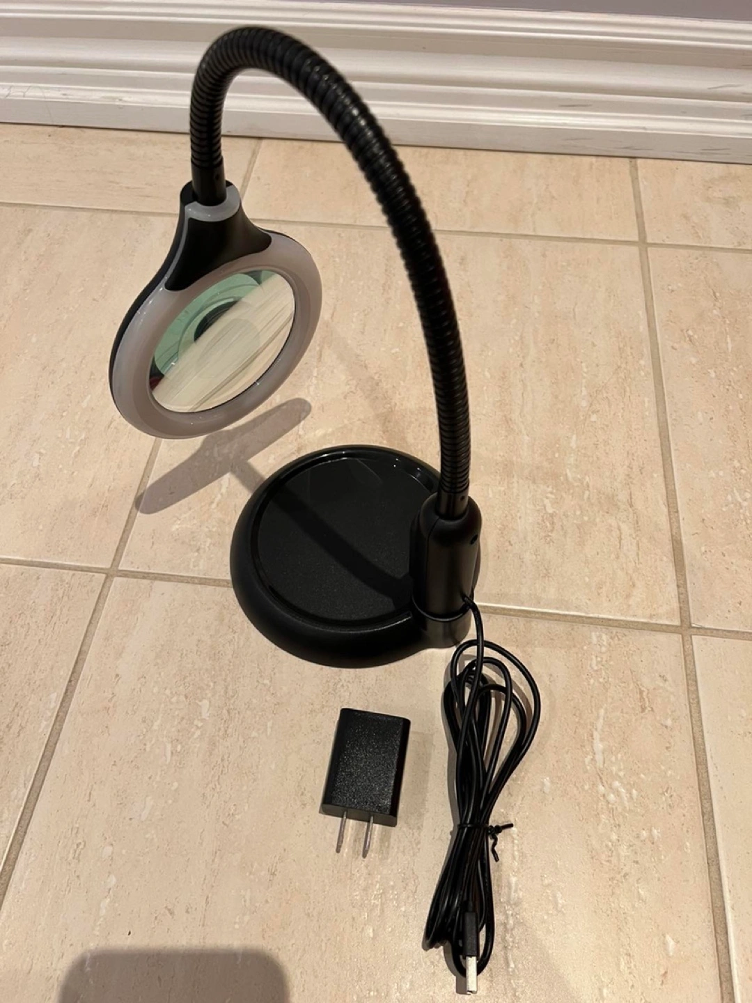 1892-in-1 magnifying desk lamp. Features a flexible gooseneck and a clamp for versatile placement. Includes a power adapter and cleaning cloth. LED light for illumination.