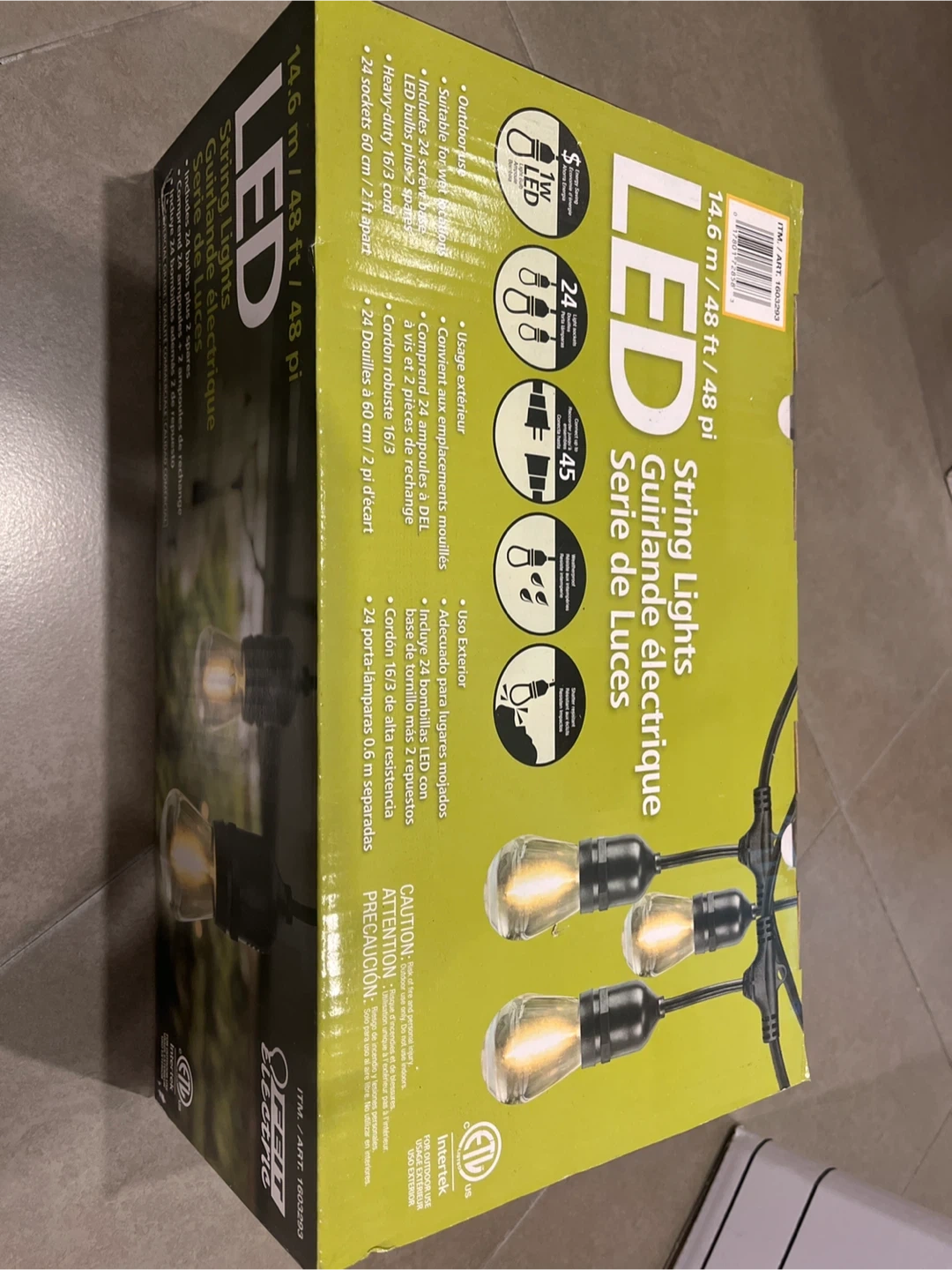 44I'm selling a new set of LED string lights, still in the original packaging! These are perfect for adding a cozy ambiance to your outdoor space. - 14.6 meters / 48 feet long - Includes 24 screw-base LED bulbs plus 2 spares - Heavy-duty 16/3 cord - 24 sockets spaced 60 cm / 2 ft apart - Suitable for wet locations