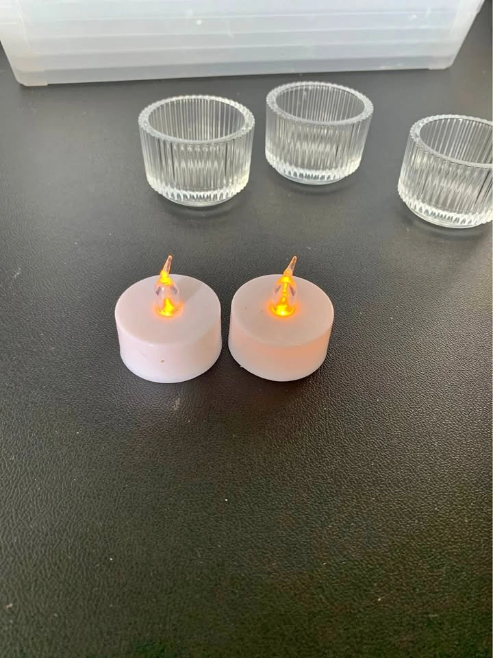 50 cents each 70 available Used once for wedding centerpieces Warm light, flickering Batteries included On/off switch underneath Glass candles holder not included, but selling for an additional 50 cents each Available for pickup