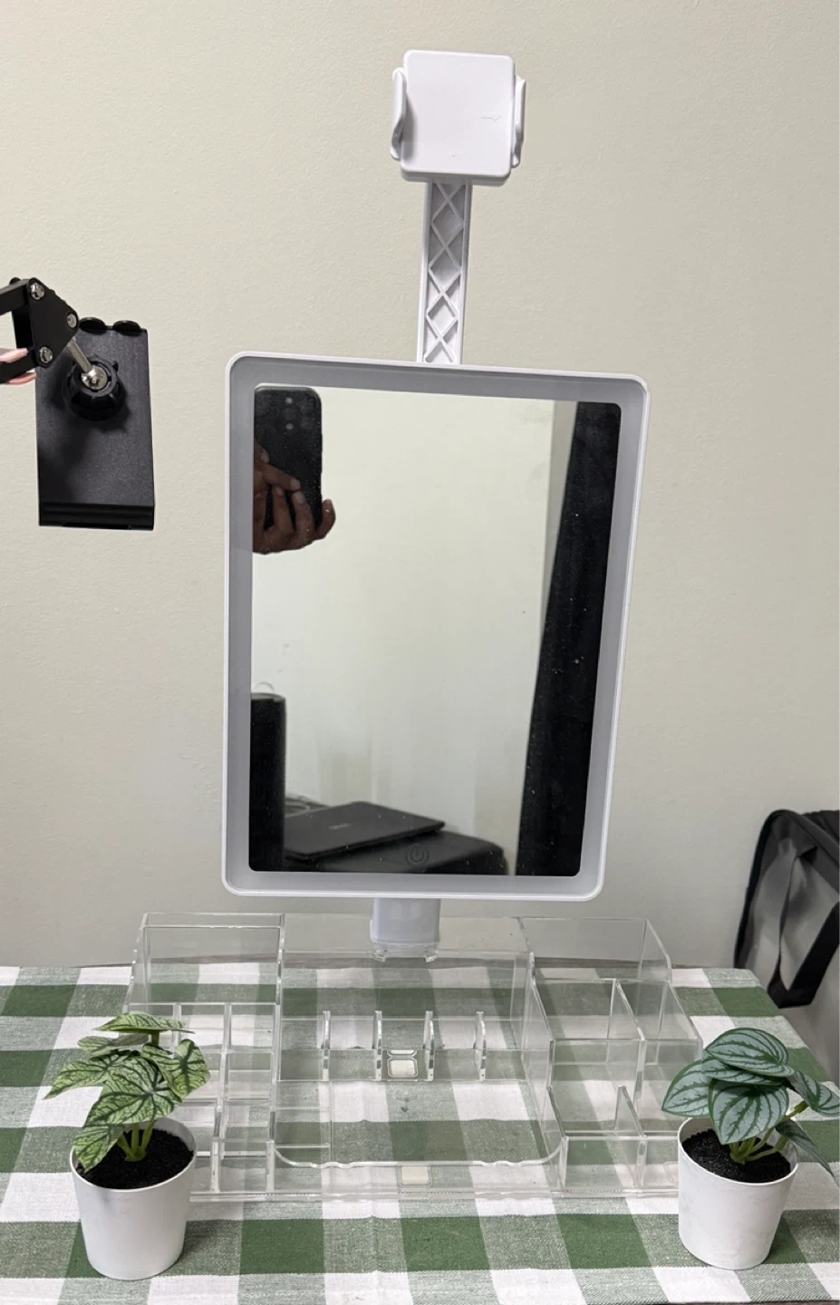 10✨ Makeup Mirror with Organizer & Mobile Holder – Perfect for Beauty Stations ✨ Upgrade your vanity setup with this stylish LED makeup mirror, complete with a clear acrylic organizer and adjustable mobile holder. 🌿 Features: • Bright touch-control LED mirror for flawless makeup application. • 360° adjustable mobile holder – ideal for tutorials, recording, or watching videos while you work. • Spacious clear organizer with multiple compartments to keep your brushes, makeup, and accessories neatly arranged. • Compact and modern design – fits perfectly on any vanity or desk. 💄 Condition: Gently used, excellent condition. 💰 Perfect for: Makeup artists, content creators, nail/henna artists, or anyone who loves a tidy and aesthetic beauty space.