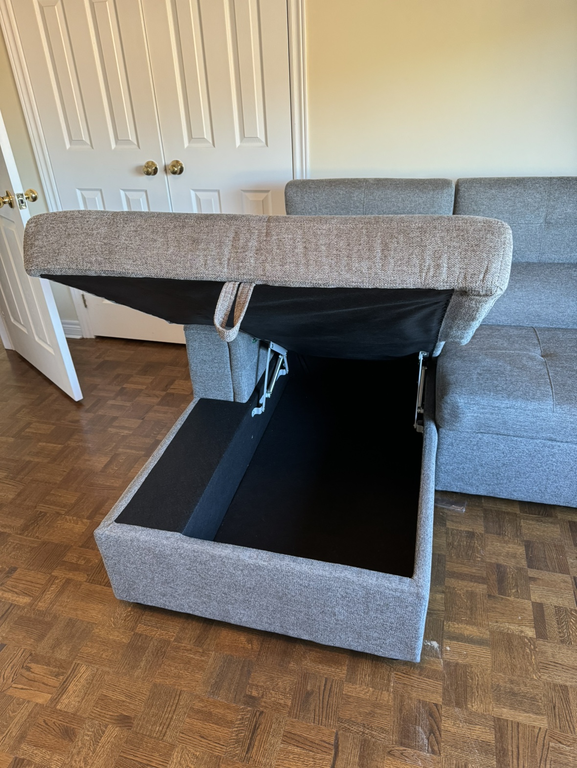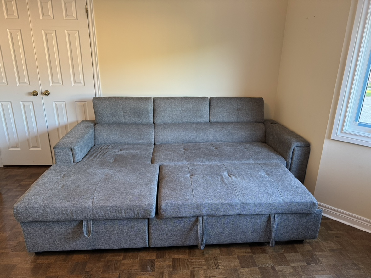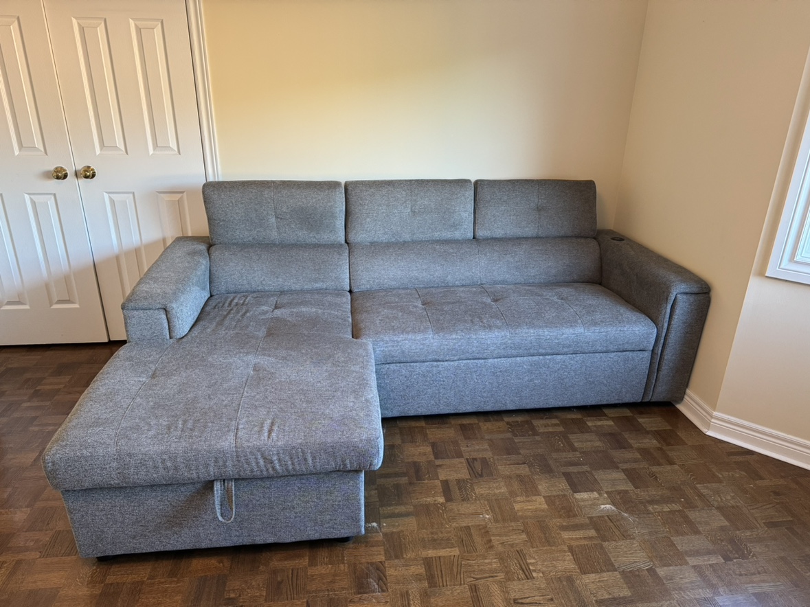 18MOVING SALE! Grey fabric left-hand sleeper sectional sofa. Bought less than a year ago. Like new. Pickup only. Left-facing chaise: 37” W x 30” H x 67” D Right-facing sleeper: 60” W x 30” H x 40” D