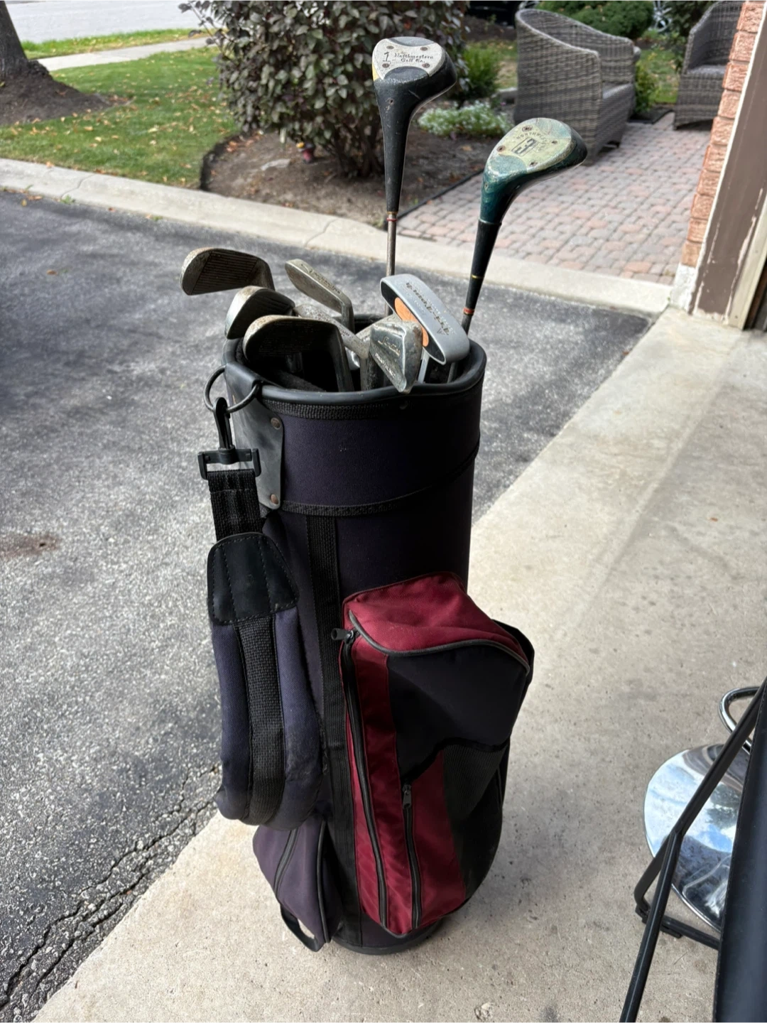 Selling a set of used golf clubs with a golf bag. The set includes various clubs, including a wood and several irons. The bag is black and red, with multiple pockets for storage. Perfect for someone starting out or looking for an affordable set! Comes with Left hand Adult golf clubs Comes with 3,4,5,6,7,8,9 iron Pitching wedge Putter 1,3 driver/club $75 P/U Brampton
