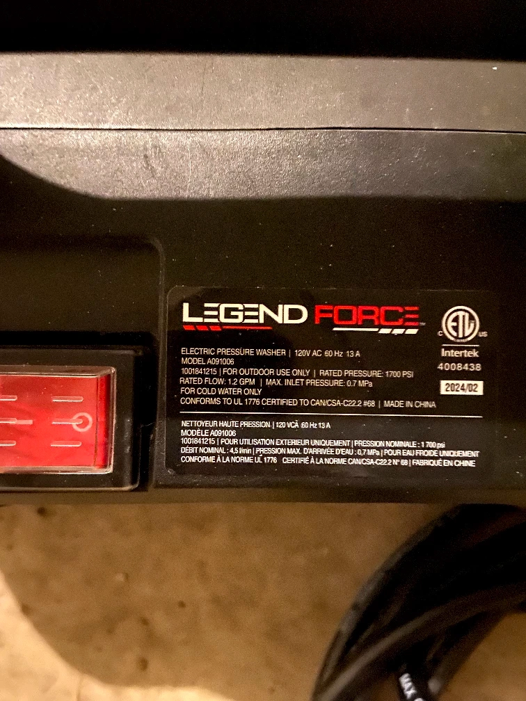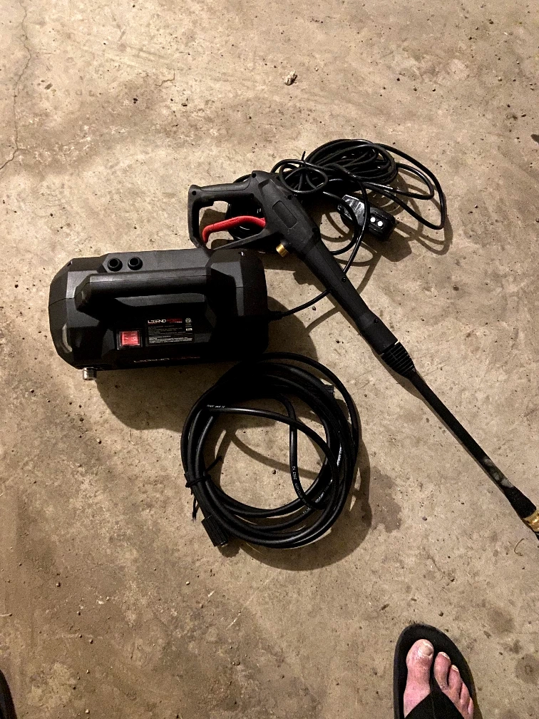 Electric pressure washer, includes wand and hose. Good for outdoor use. Cold water only. Model AD01005.