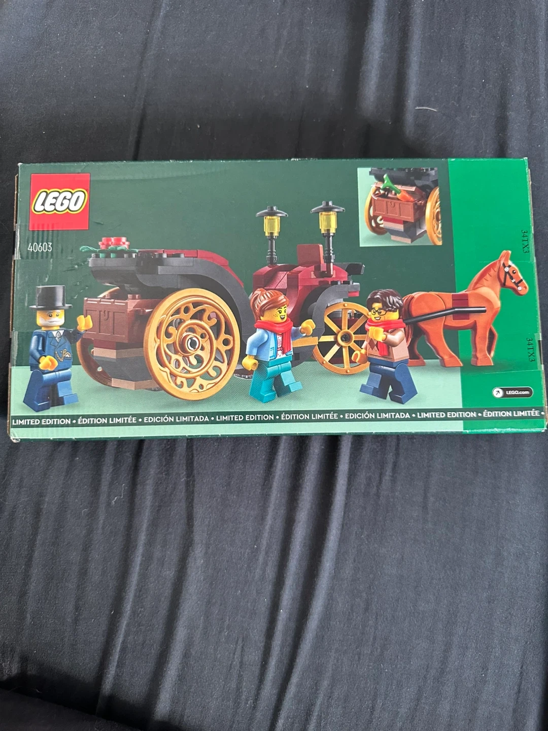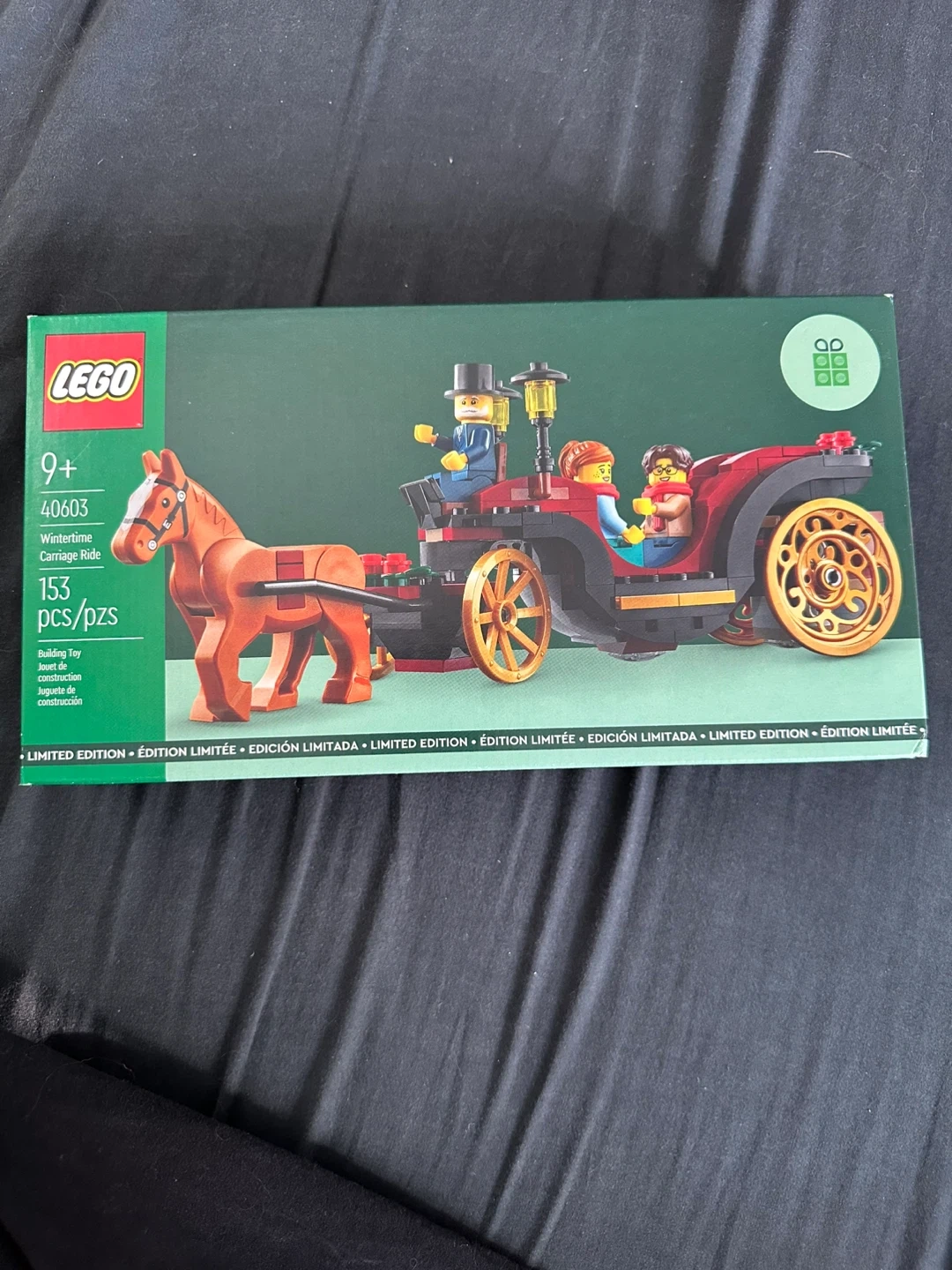 123Selling a LEGO set, number 40603, called Wintertime Carriage Ride. It's a limited edition set for ages 9+. The box contains 153 pieces to build a charming carriage scene with figures. Perfect for LEGO enthusiasts and collectors!