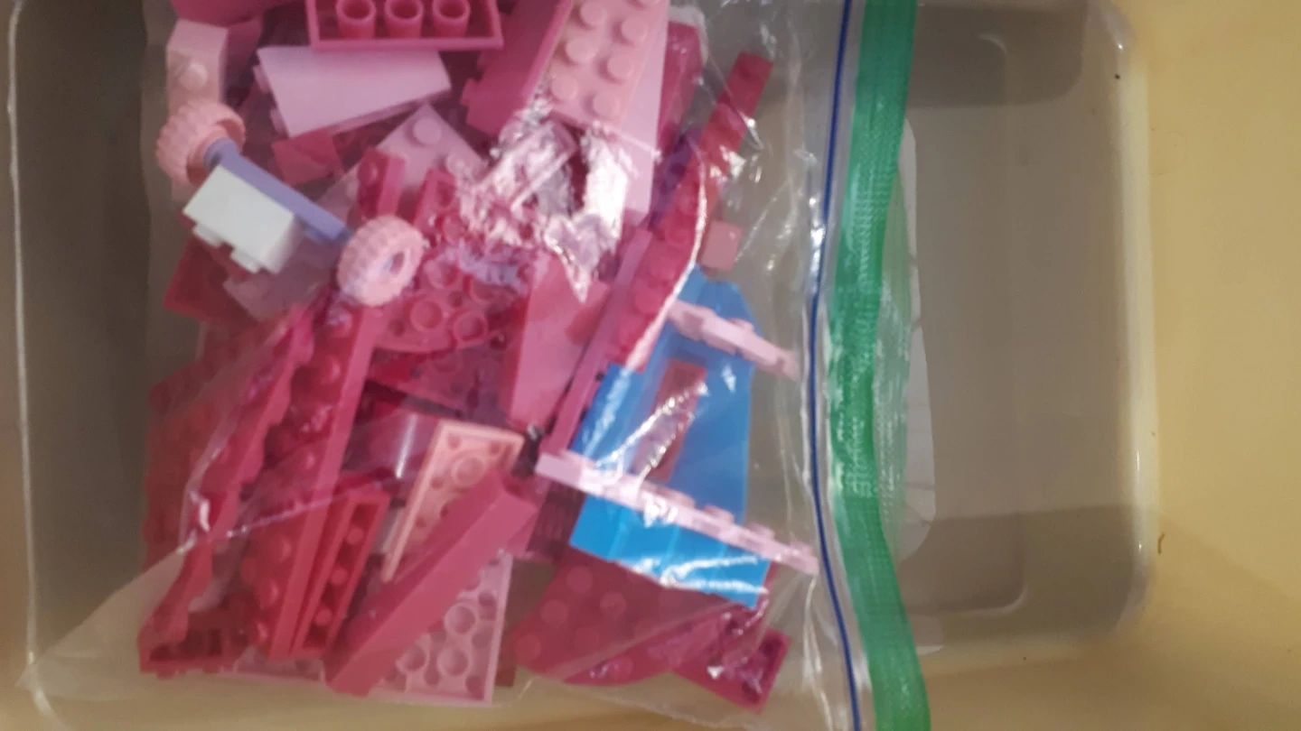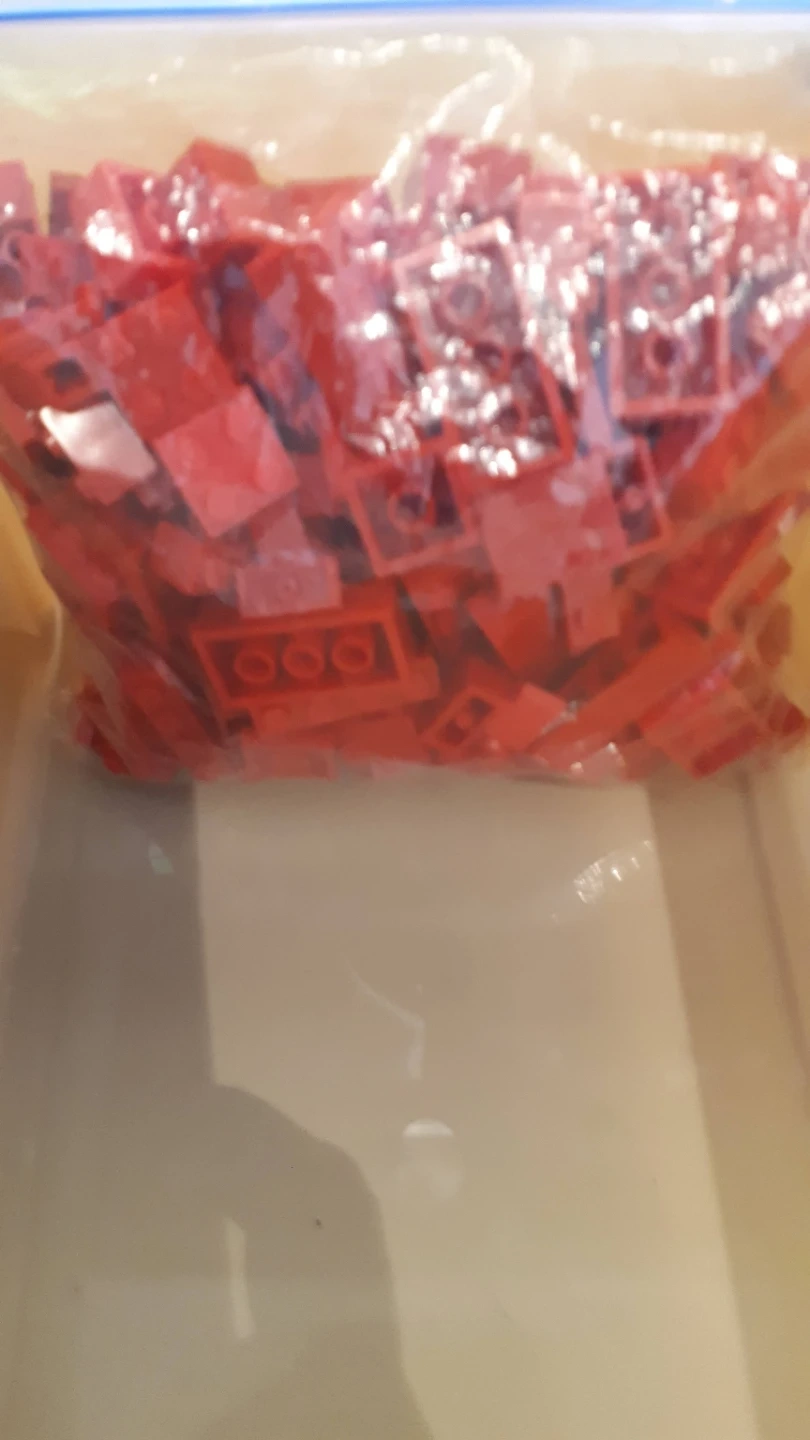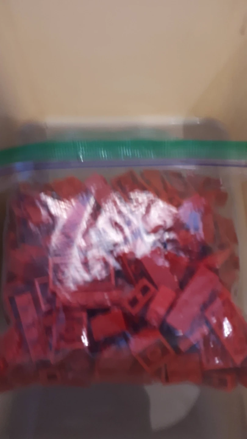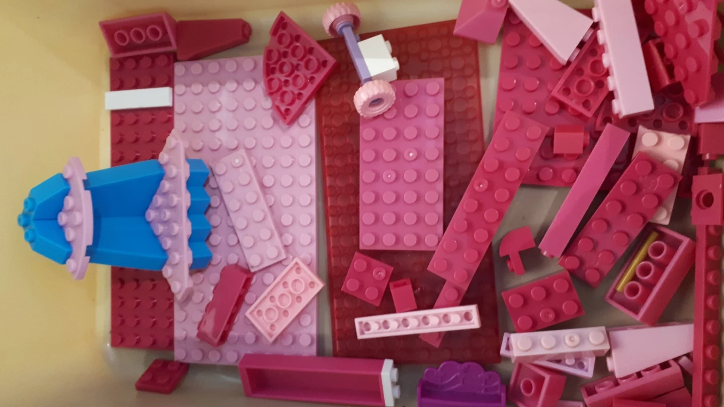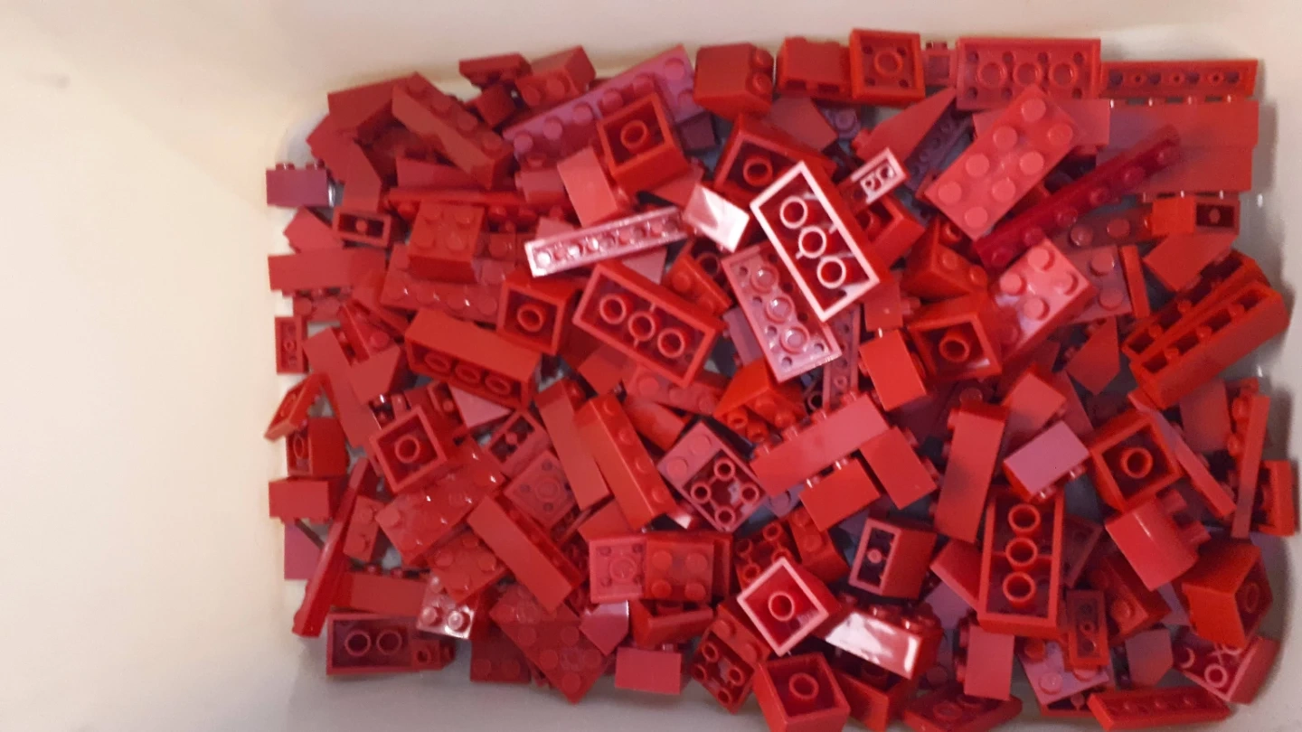 0A mixed lot of Lego bricks in various shades of red, pink, and blue. Perfect for expanding your collection or starting a new project!