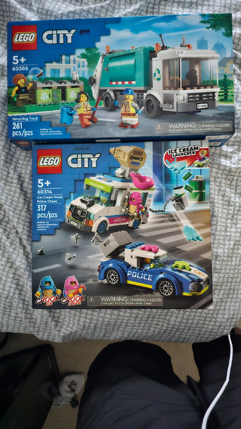 10Two LEGO City sets for sale! - LEGO City 60386 Recycling Truck (261 pieces) - LEGO City 60314 Ice Cream Truck Police Chase (317 pieces) Both sets are suitable for ages 5+