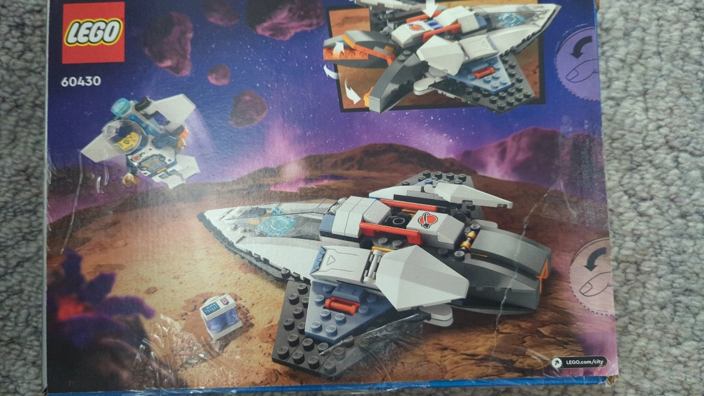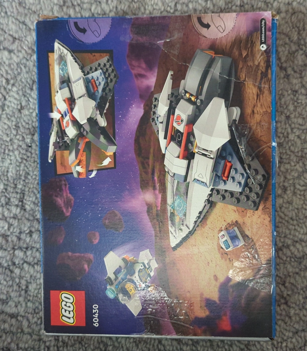 LEGO set. Includes a spaceship, astronaut minifigure, and a small space station. Complete with instructions.