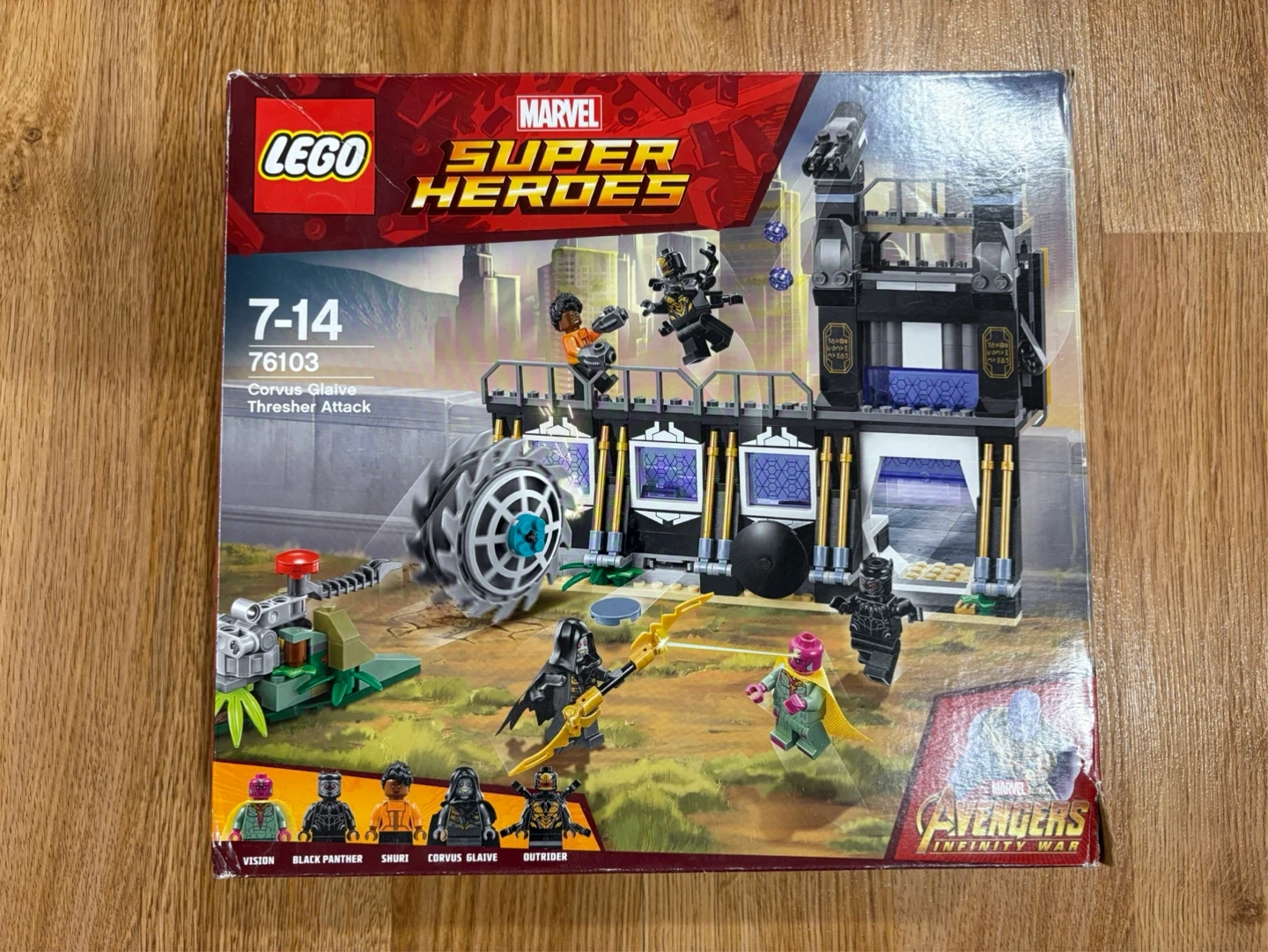 LEGO Marvel Super Heroes, called Corvus Glaive Thresher Attack, set number 76103! Includes box, instruction books, and all pieces organized in numbered bags. Recommended for ages 7-14, 416 pieces, great set and really fun to build!