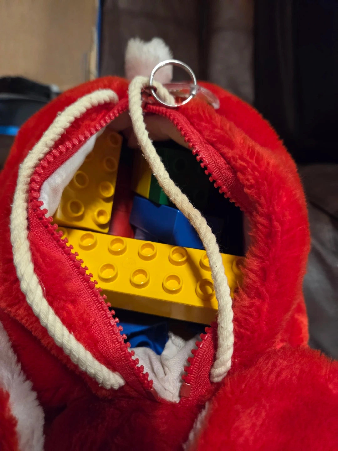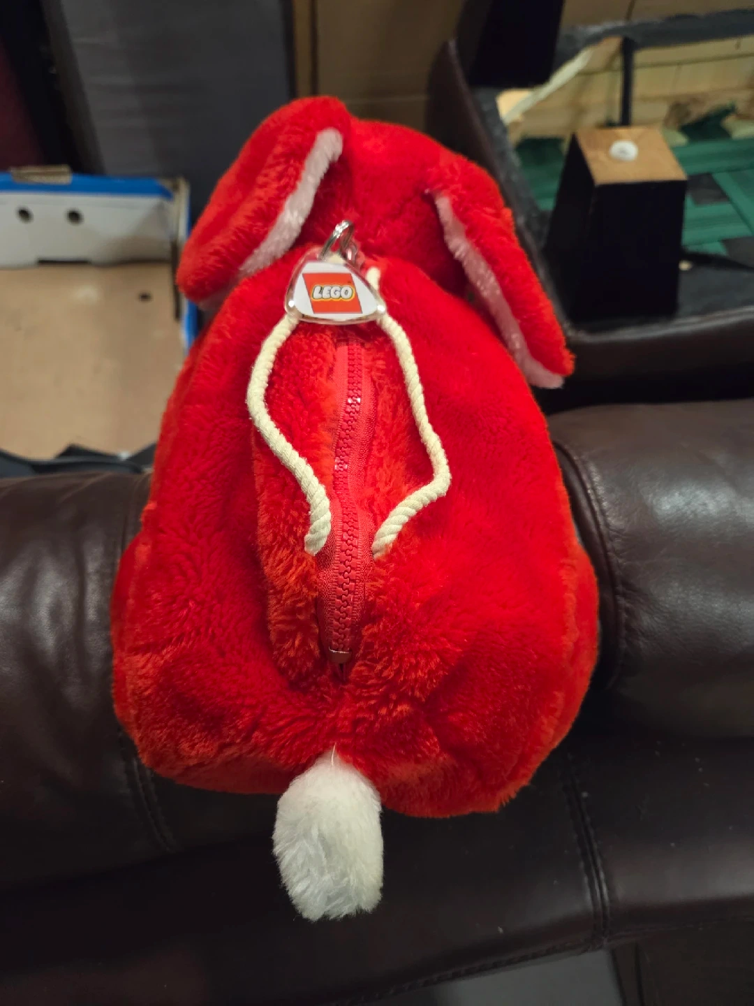60This is a cute red bunny plush toy from LEGO! It's in great condition and ready for a new home. It has a zipper on the front, and can be used to store small items.