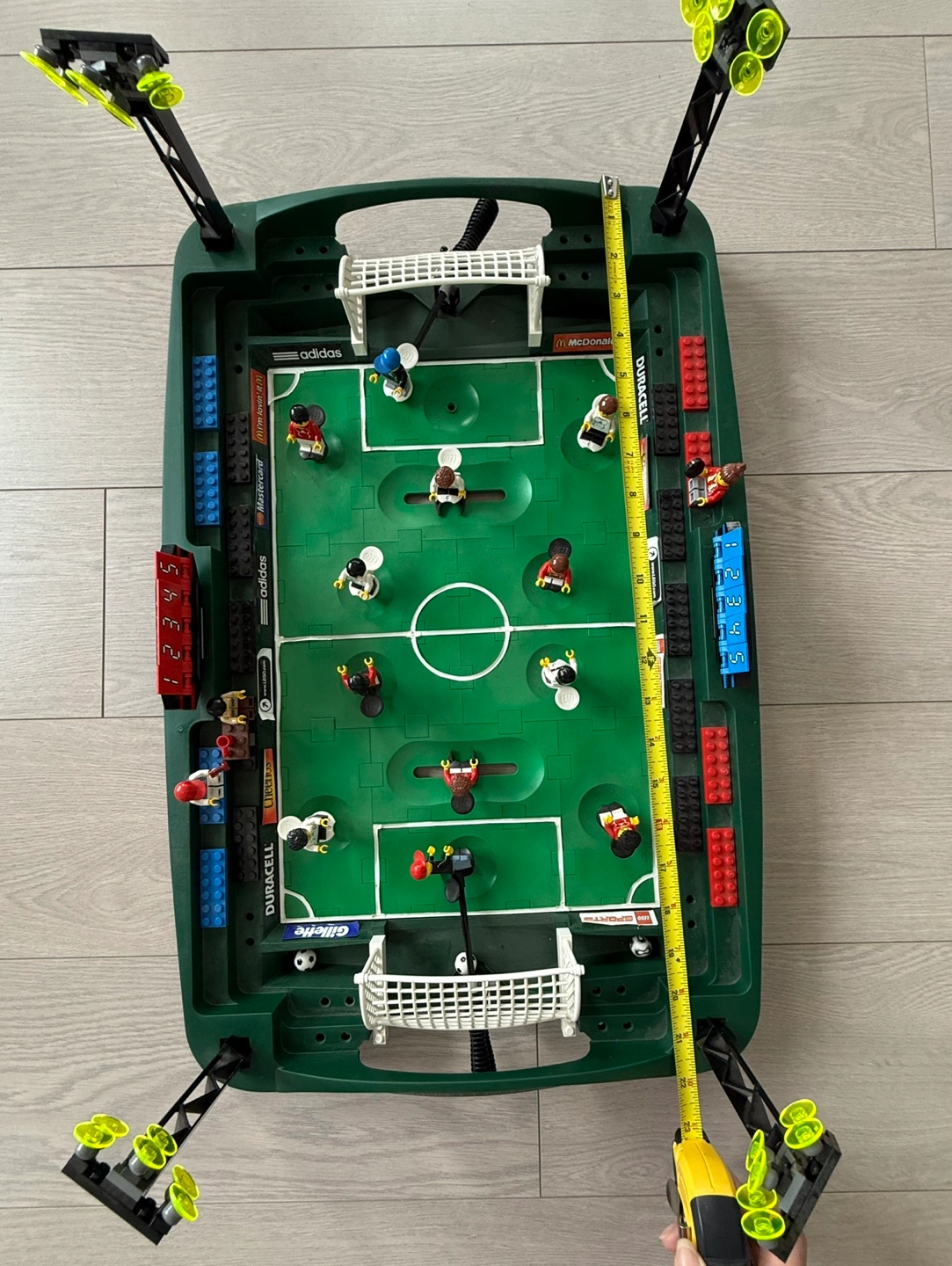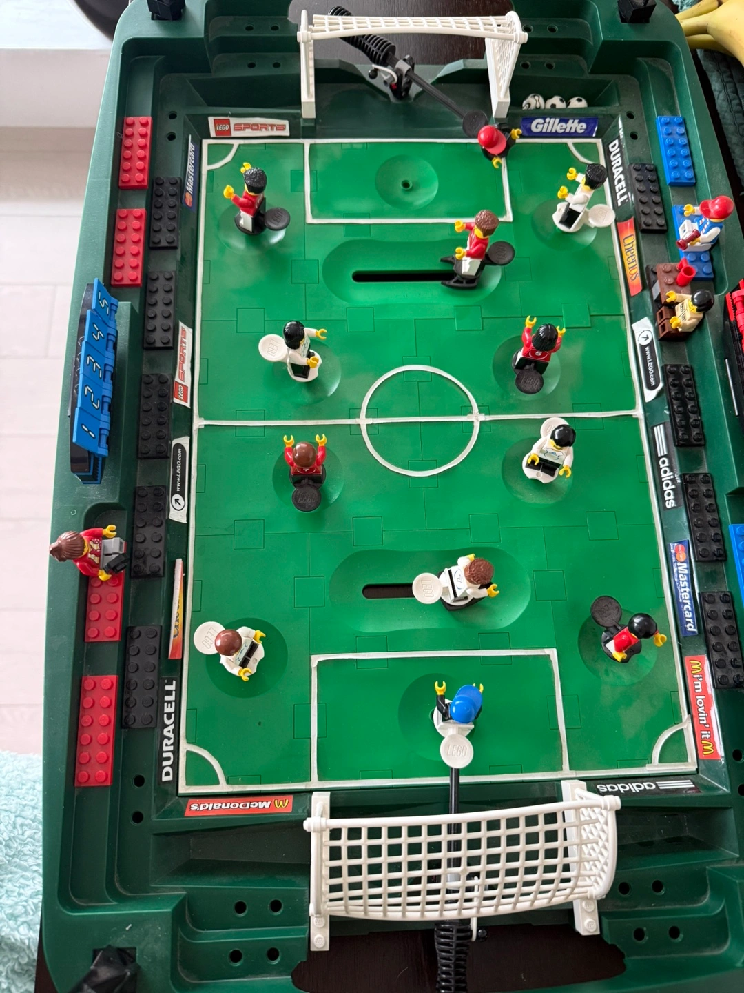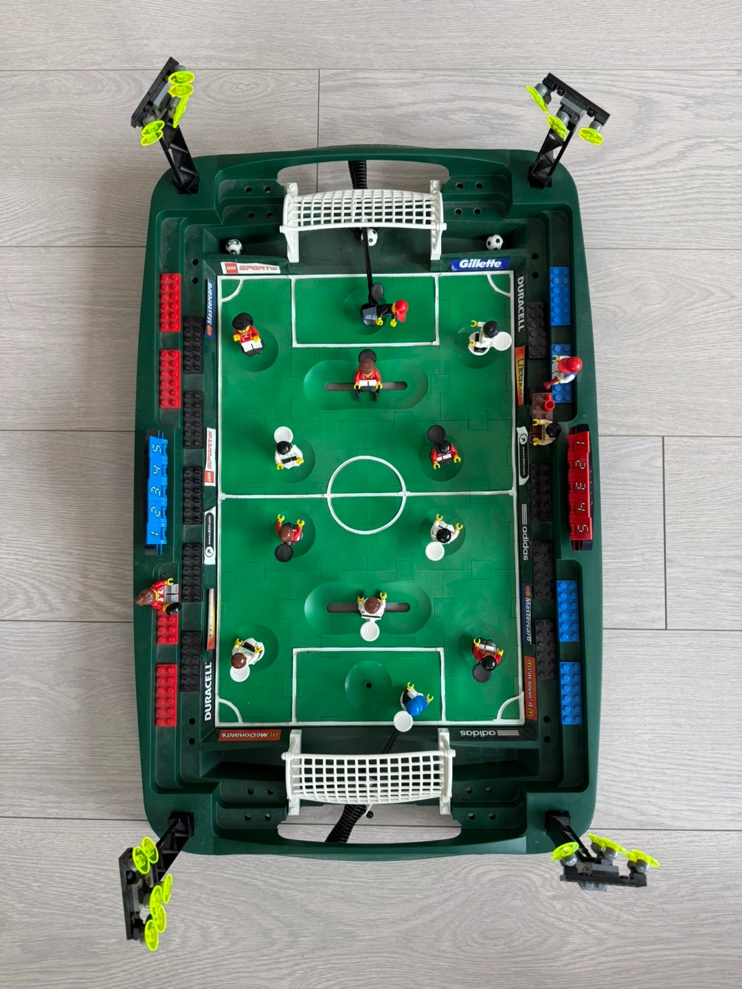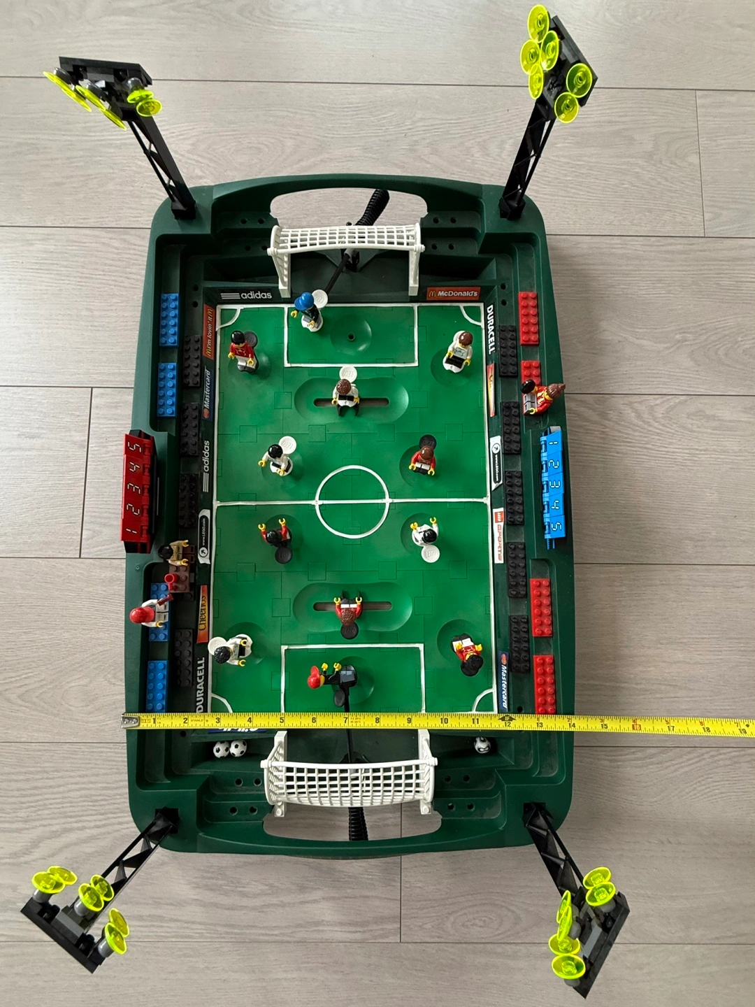 23LEGO foosball table game with lights, includes all players and ball. Good used condition with some wear and tear. No missing pieces or damage. Measures approximately 19 inches x 14 inches.