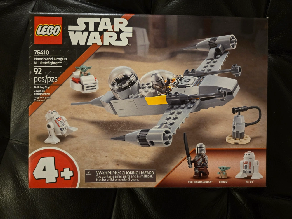 597New LEGO Star Wars building toy. Includes Mando, Grogu, and R5-D4 minifigures. 92 pieces. Ages 4+. N-1 Starfighter model.