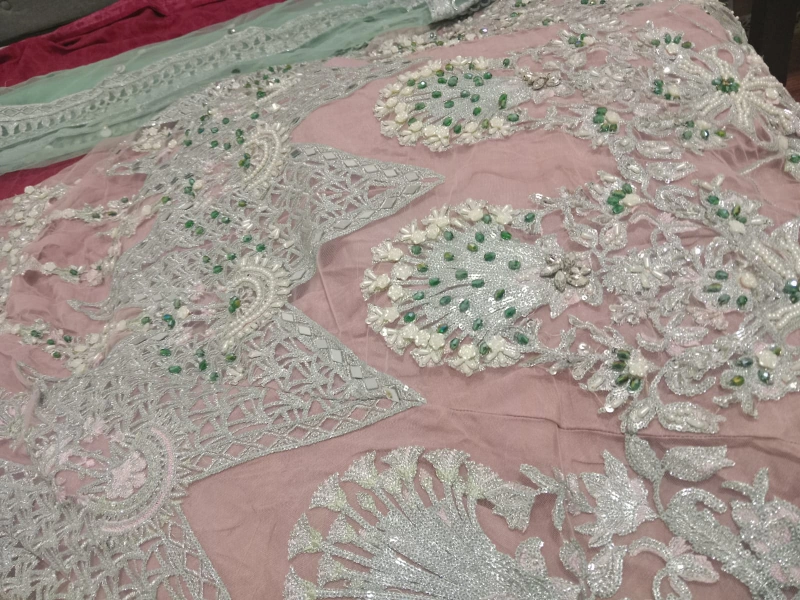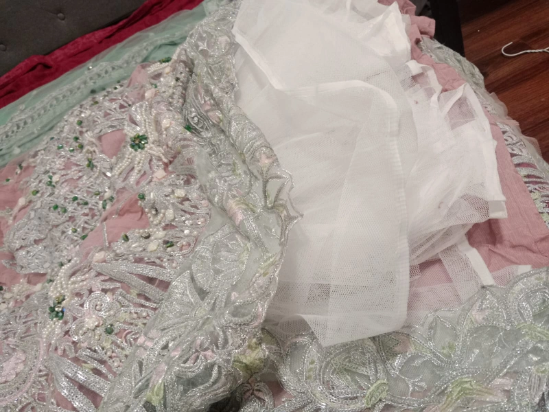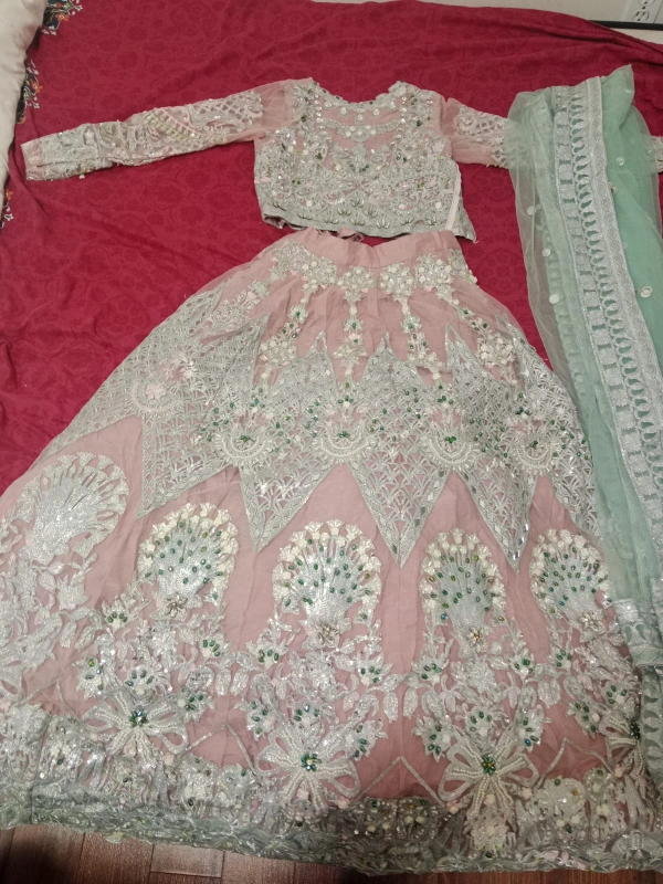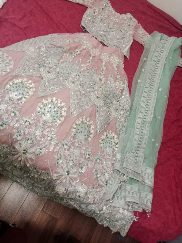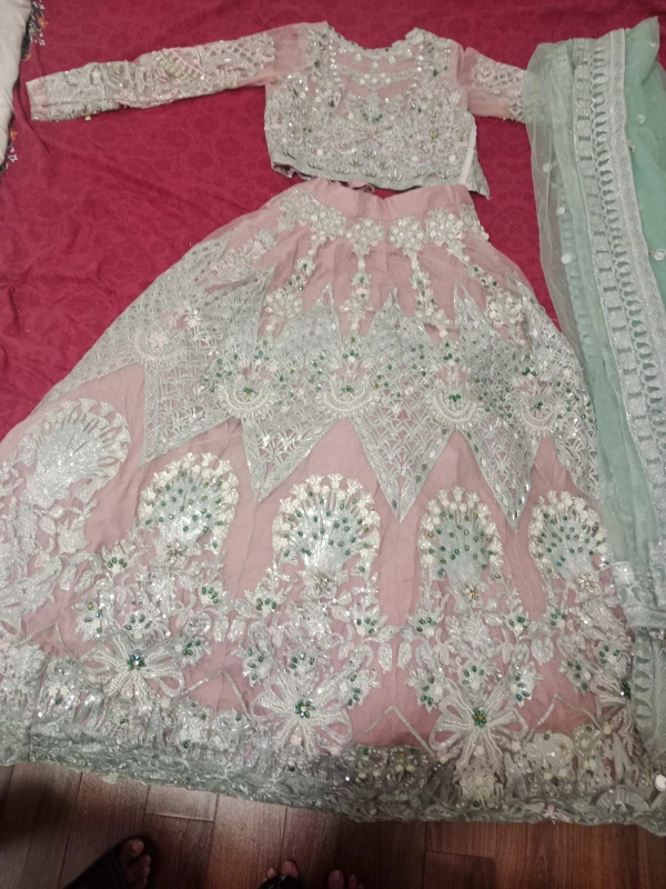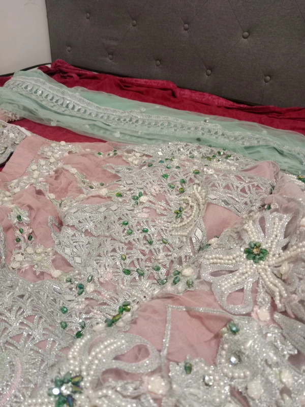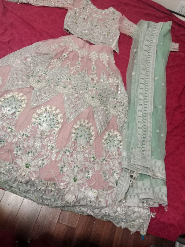 10Beautiful lehenga choli set in a lovely pink and green colour combination. The outfit features intricate silver embroidery and beadwork. Includes the skirt (lehenga), top (choli), and scarf (dupatta).