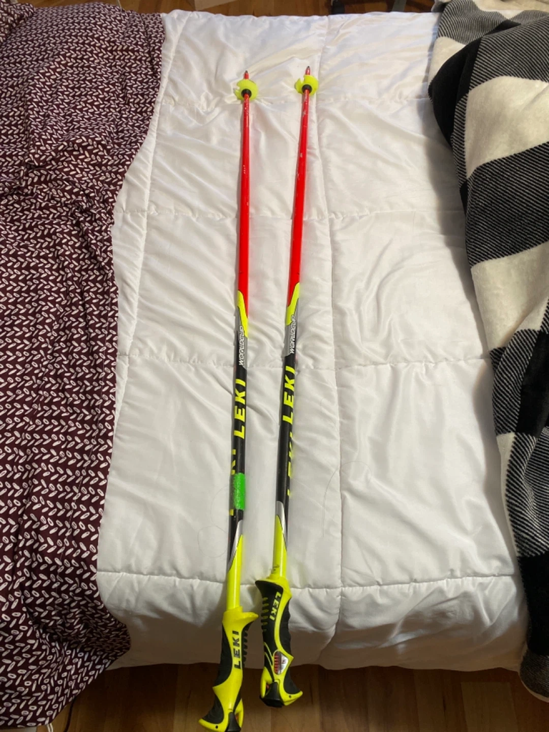 60Selling a pair of LEKI Worldcup ski poles. They are red, yellow, and black. Great for hitting the slopes!