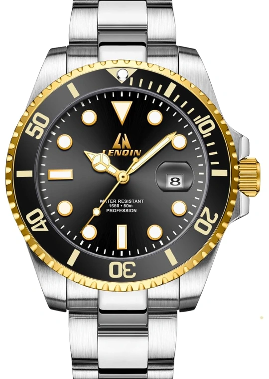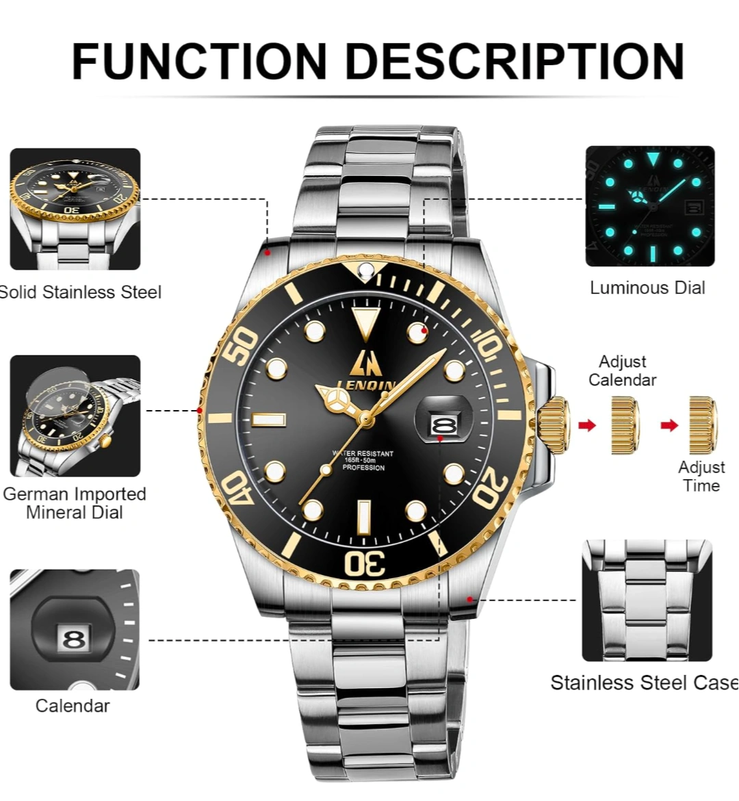60Selling a men's watch with a stainless steel band and a black dial with gold accents. It features a luminous dial, calendar, and is water resistant to 50M. The watch has a solid stainless steel case and band, and a German imported mineral dial