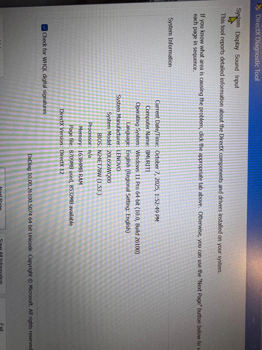 Condition: Excellent | Ready to Use | Professionally Maintained ๐ง Specifications: ๐ฝ Processor: Intel Core i5 (8th Gen) โก RAM: 16 GB DDR4 ๐พ Storage: 256 GB SSD (Fast & Reliable) ๐ฎ Graphics: Intel UHD Graphics 620 ๐ช Operating System: Windows 11 Pro (Activated & Updated โ Build 26100) ๐บ Display: 14-inch Full HD (1920ร1080) Anti-Glare ๐งฐ System Manufacturer: Lenovo ๐งพ Model: ThinkPad T480 (20L5S0W700) ๐ Security: Fingerprint Scanner (Works perfectly) ๐ Ports: USB-C (with charging), HDMI, Ethernet, USB 3.0, SD card reader, headphone jack ๐ Battery Info: Internal Battery 1 โ (not holding charge) External Battery 2 โ Working fine, holds good backup (Laptop works perfectly on power adapter or battery 2) โจ Features: โ Classic ThinkPad build โ durable and professional โ Backlit keyboard & fingerprint login โ Fresh Windows 11 Pro installation โ Perfect for office, students, developers, or remote work โ Runs quiet and stays cool ๐งฐ BIOS: N24ET98W (1.53) DirectX Version: 12 ๐ Pickup/Delivery: Local pickup or meet-up available