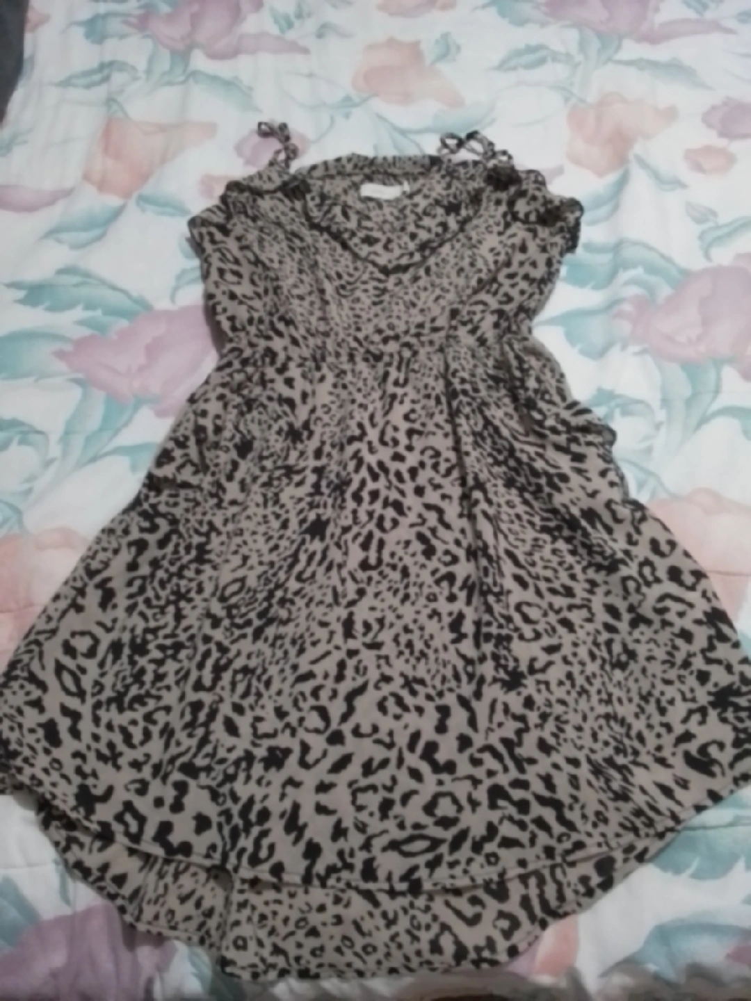 65This dress has a fun leopard print and cute tie straps! It's in great condition and ready for a new home