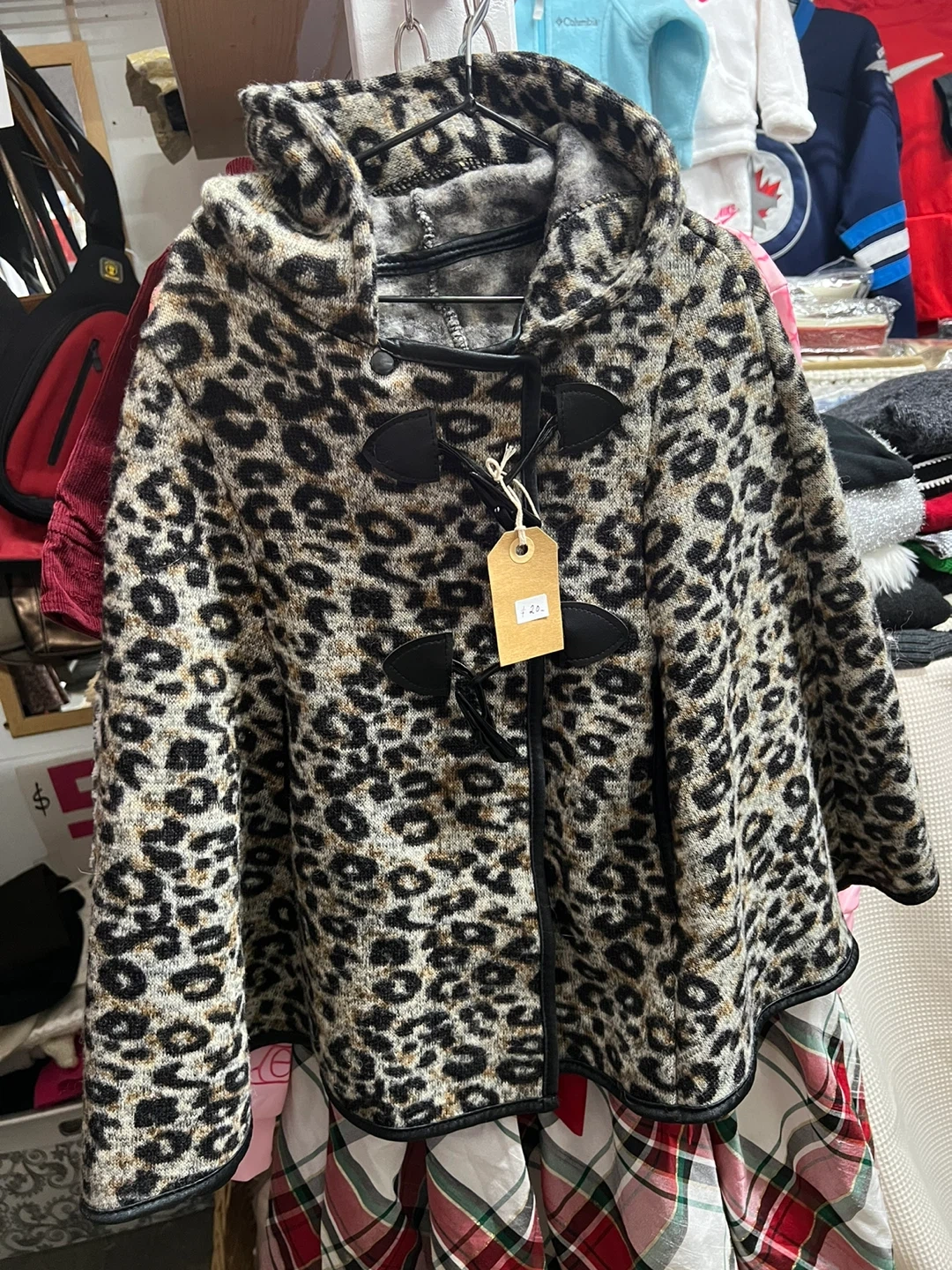 374Check out this girl’s poncho with hood. It features a fun leopard print and a comfortable hood, perfect for adding a touch of flair to any outfit. Fit to 5-7 yrs old.
