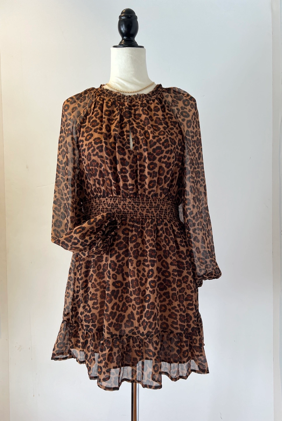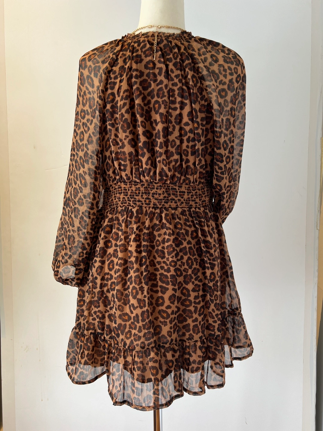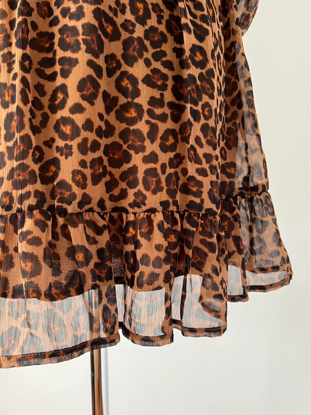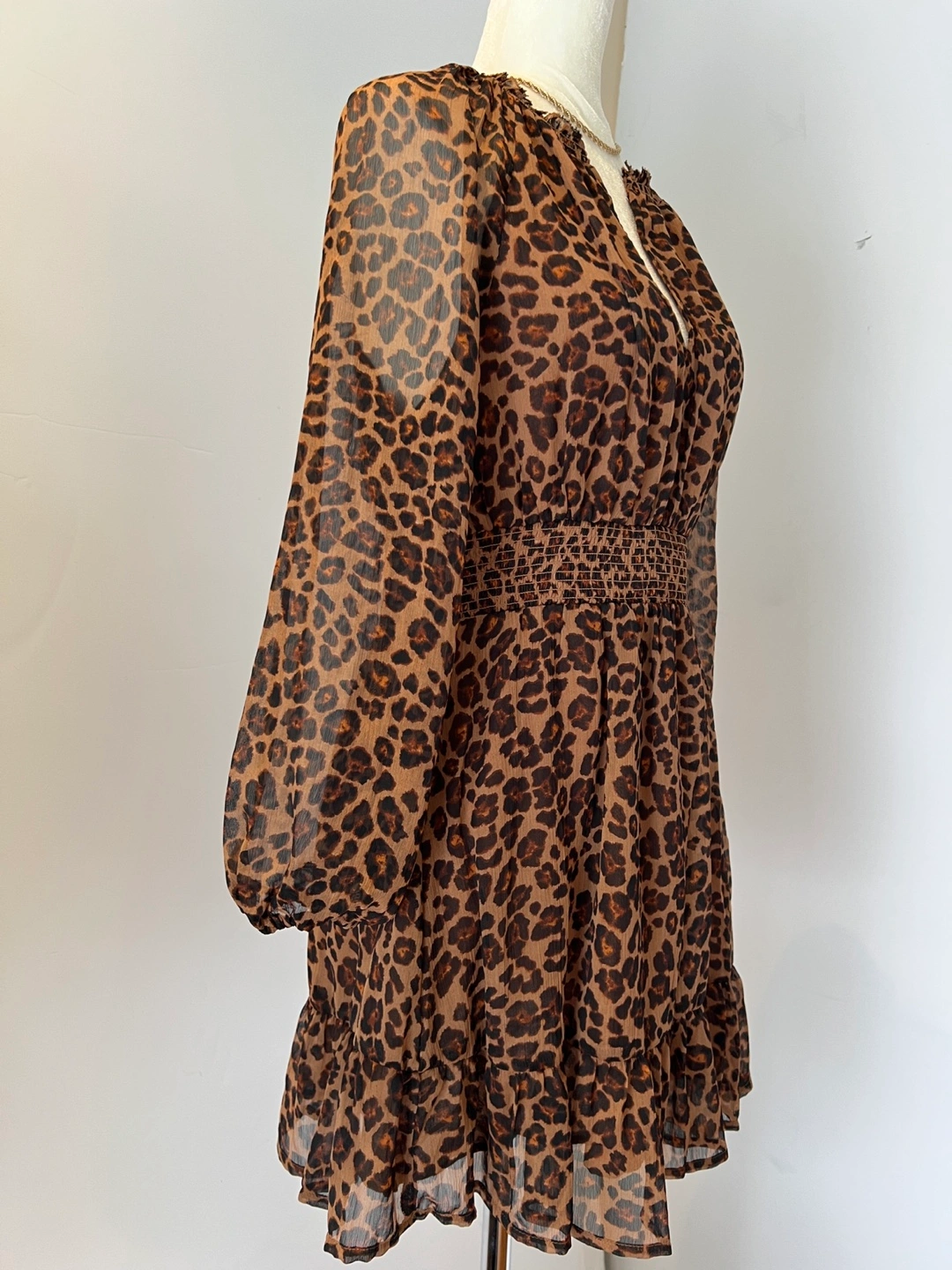 Brown and black leopard print mini dress. Three quarter sheer sleeves. Elastic waistband. Layered ruffle hem. Sheer fabric.