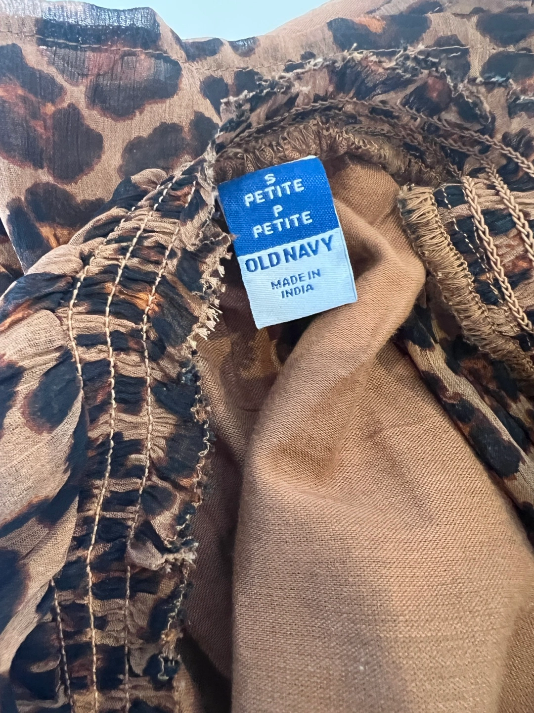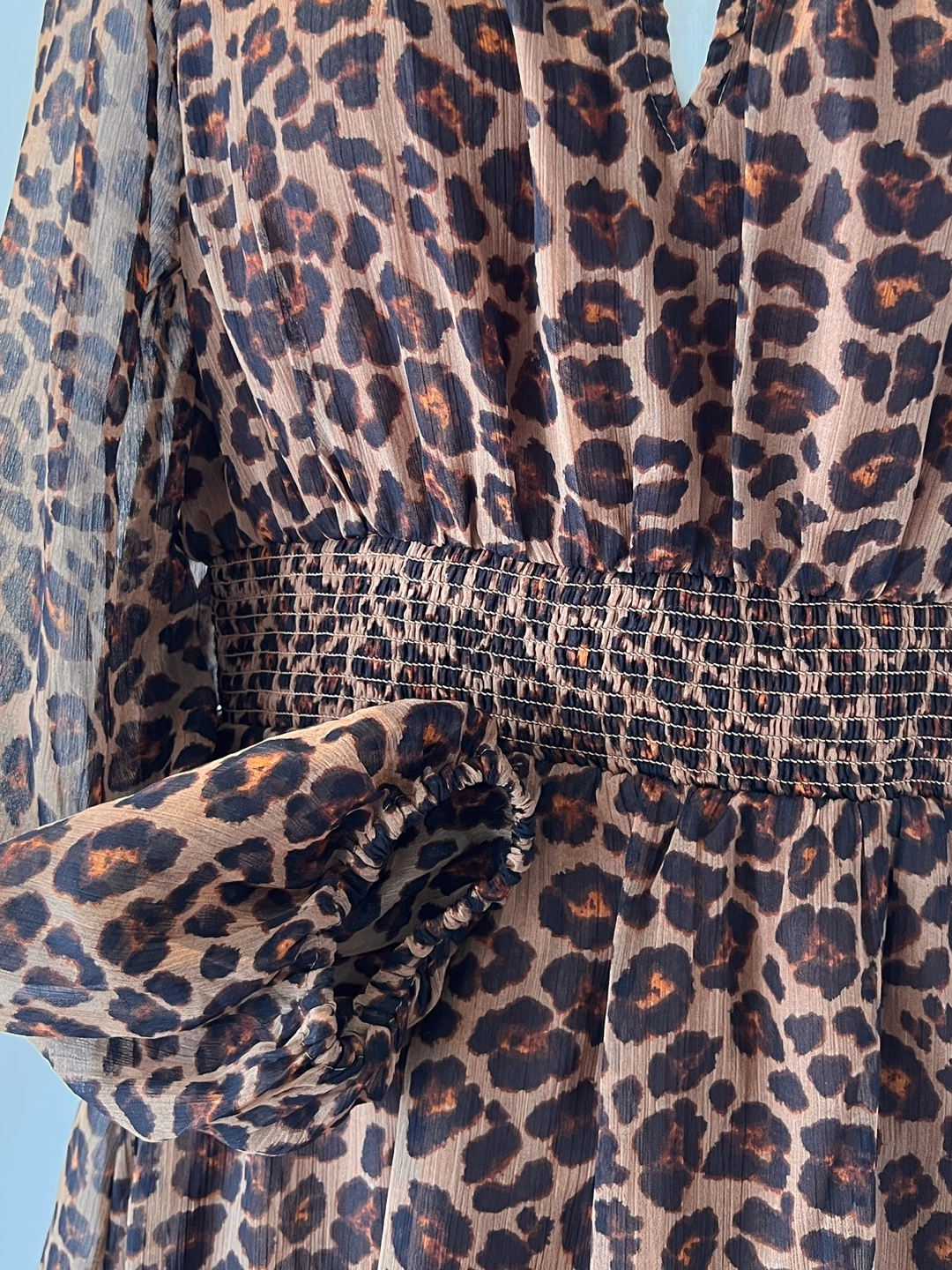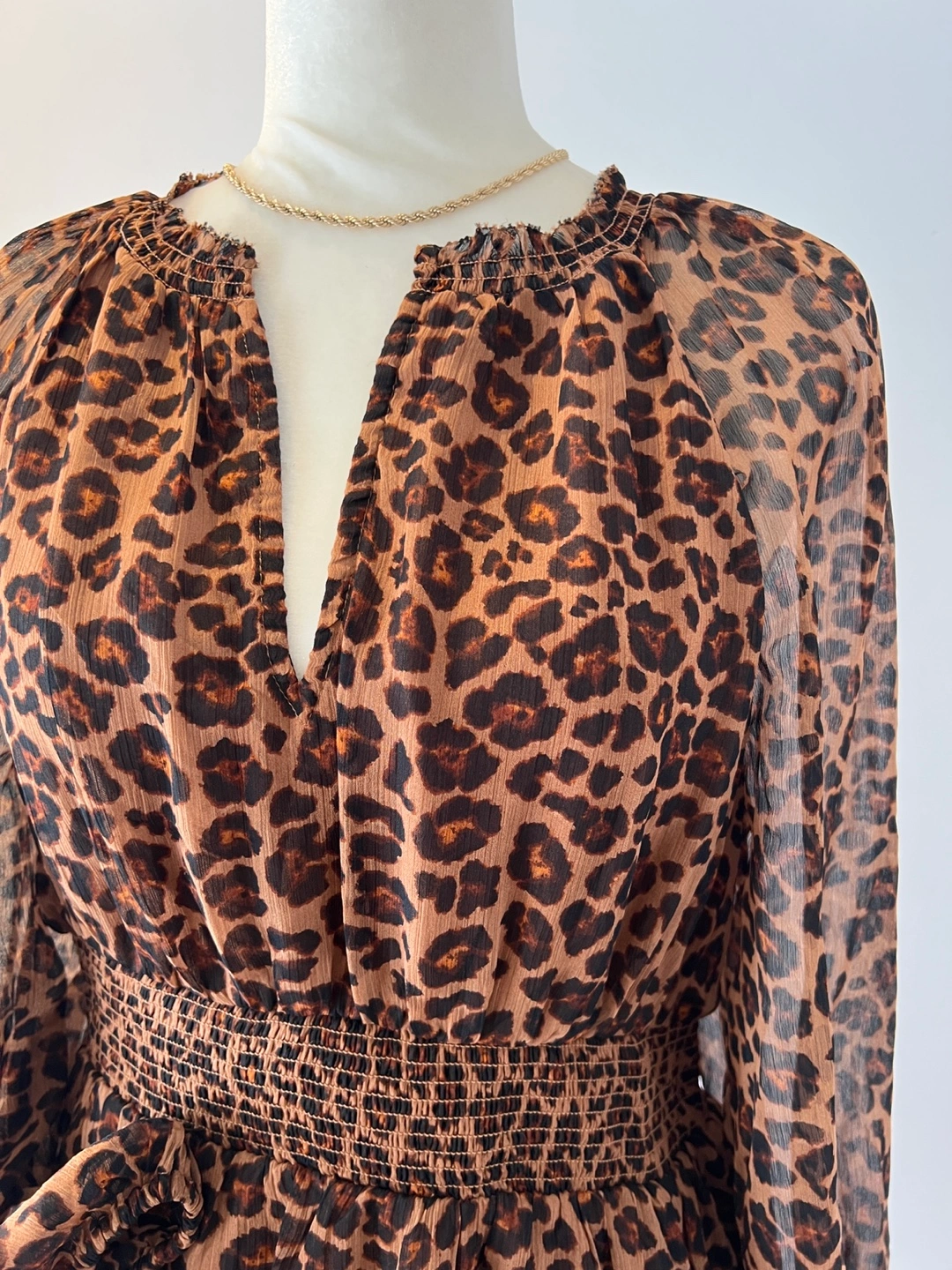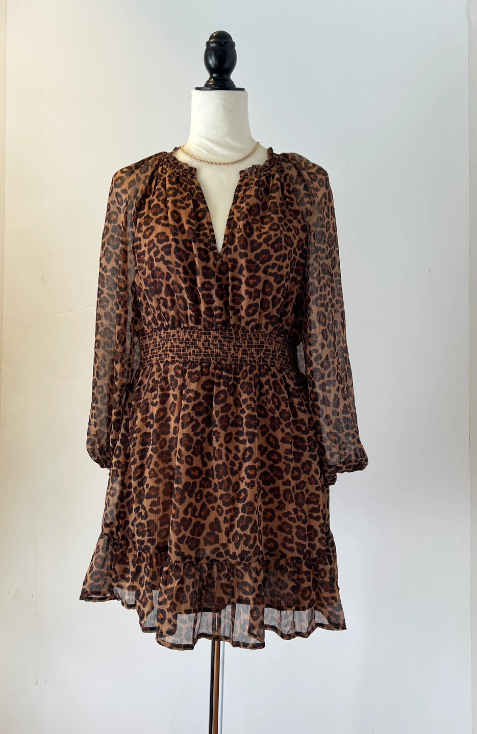 Brown and black leopard print mini dress. Three quarter sheer sleeves. Elastic waistband. Layered ruffle hem. Sheer fabric.