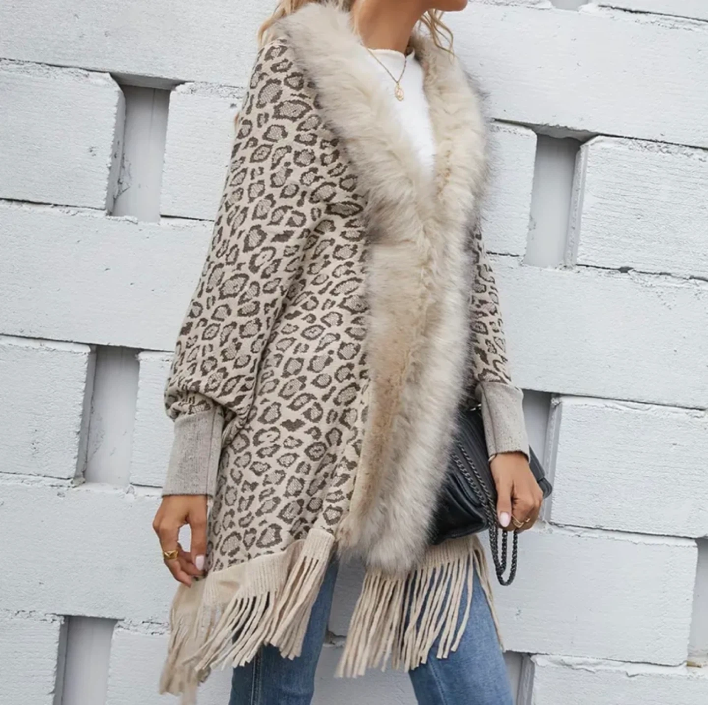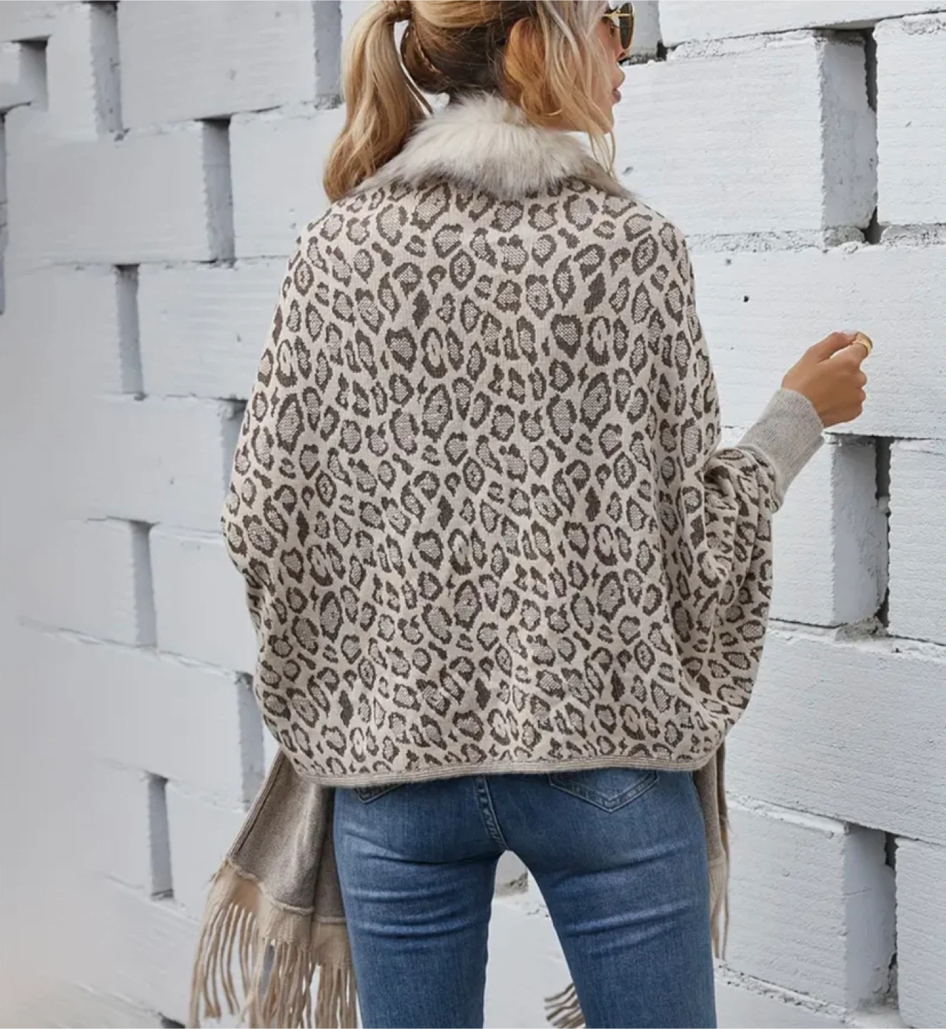 Selling a stylish leopard print poncho featuring a soft fur collar. It's a unique and fashionable piece that will keep you warm and looking great! The poncho also has fringe detailing.