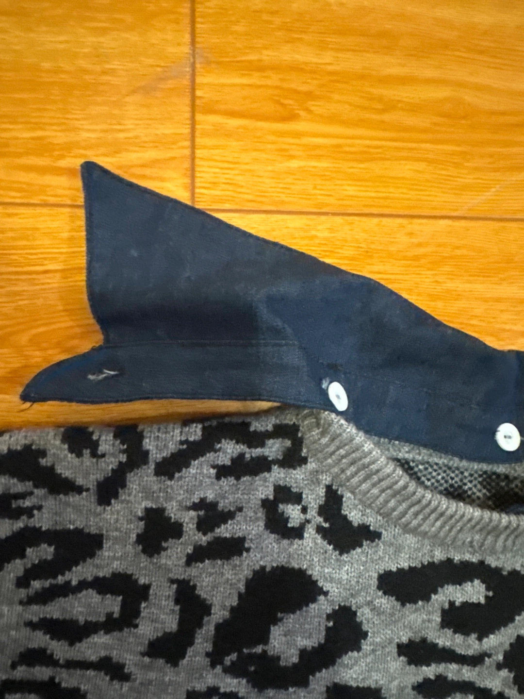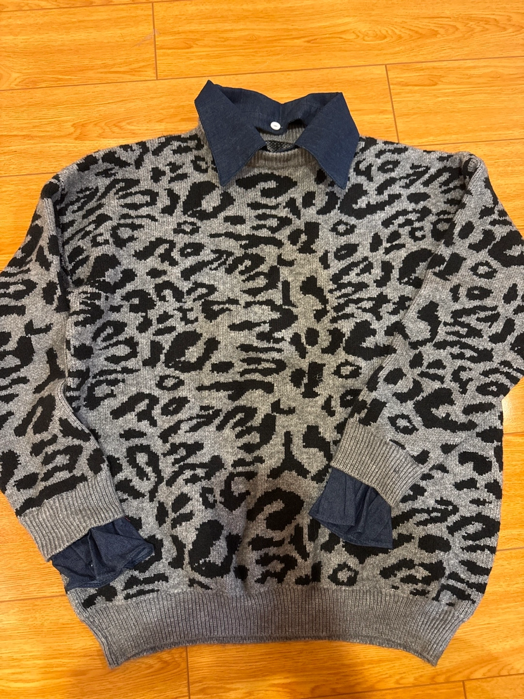 Selling a stylish sweater with a unique leopard print design! It features a denim collar and cuffs, adding a trendy touch to the classic sweater look. Perfect for adding some flair to your wardrobe