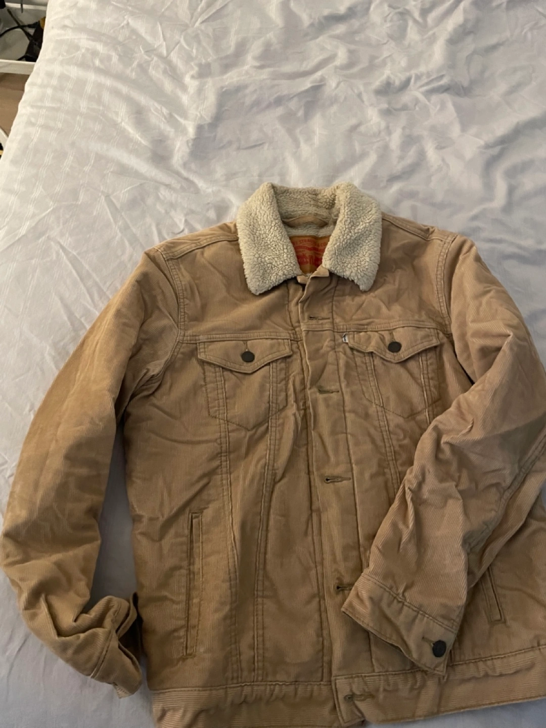 Men's tan corduroy jacket. Sherpa collar. Button closure. Two front pockets. Long sleeves. Good condition.