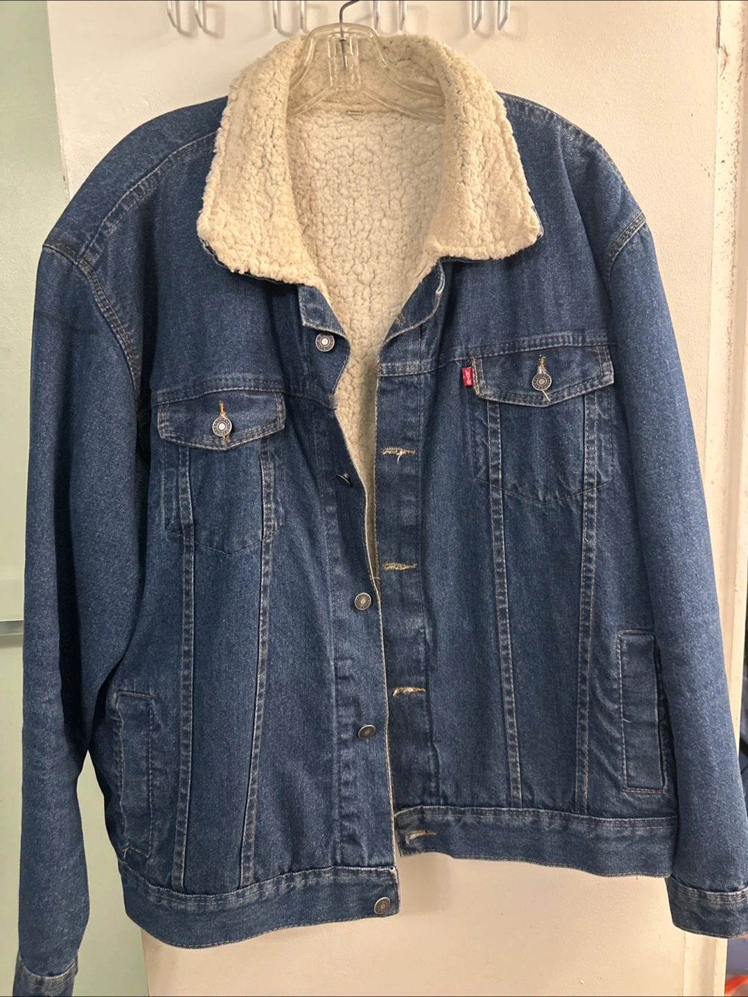 Cozy up in this classic Levi's denim trucker jacket! It features a warm sherpa lining and a timeless denim look. Perfect for adding a touch of style and warmth to any outfit.