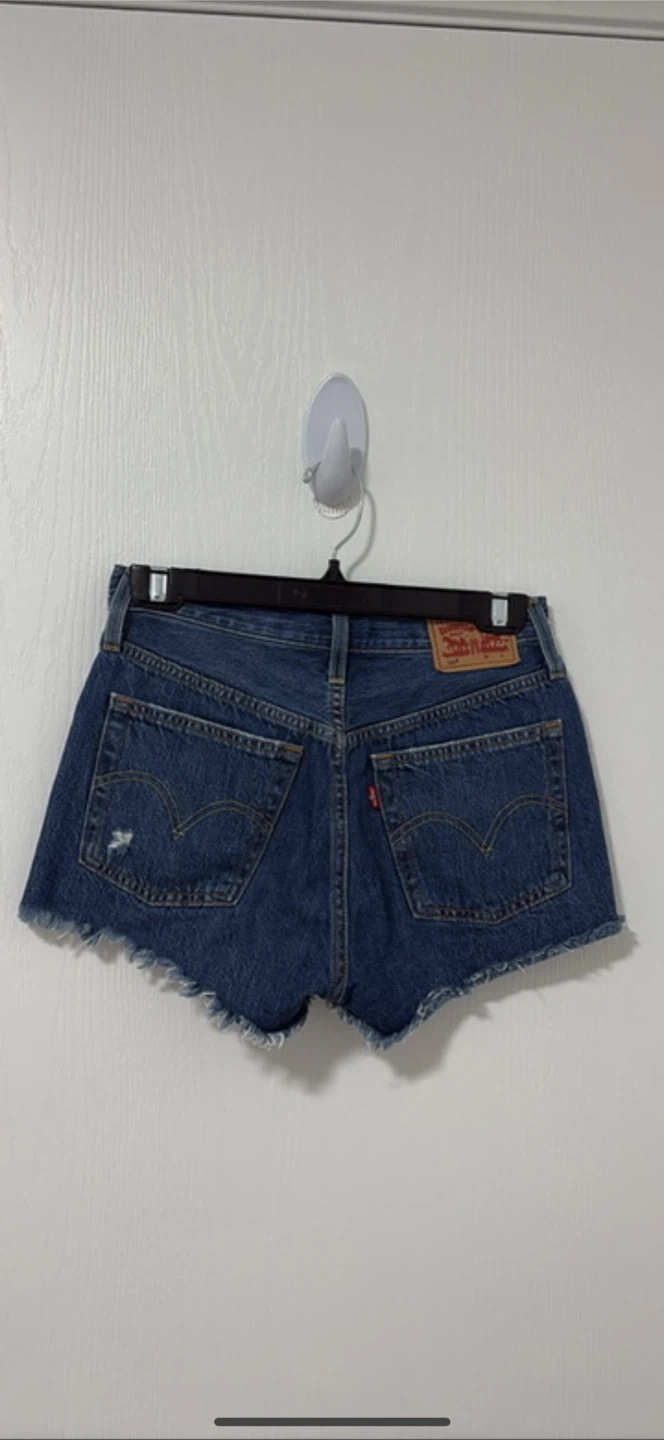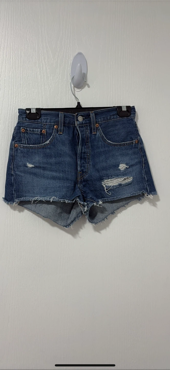 160Levi's denim shorts in size 25. These shorts are in good condition and have a distressed, frayed hem. Perfect for a casual, stylish look! Pick up cash only