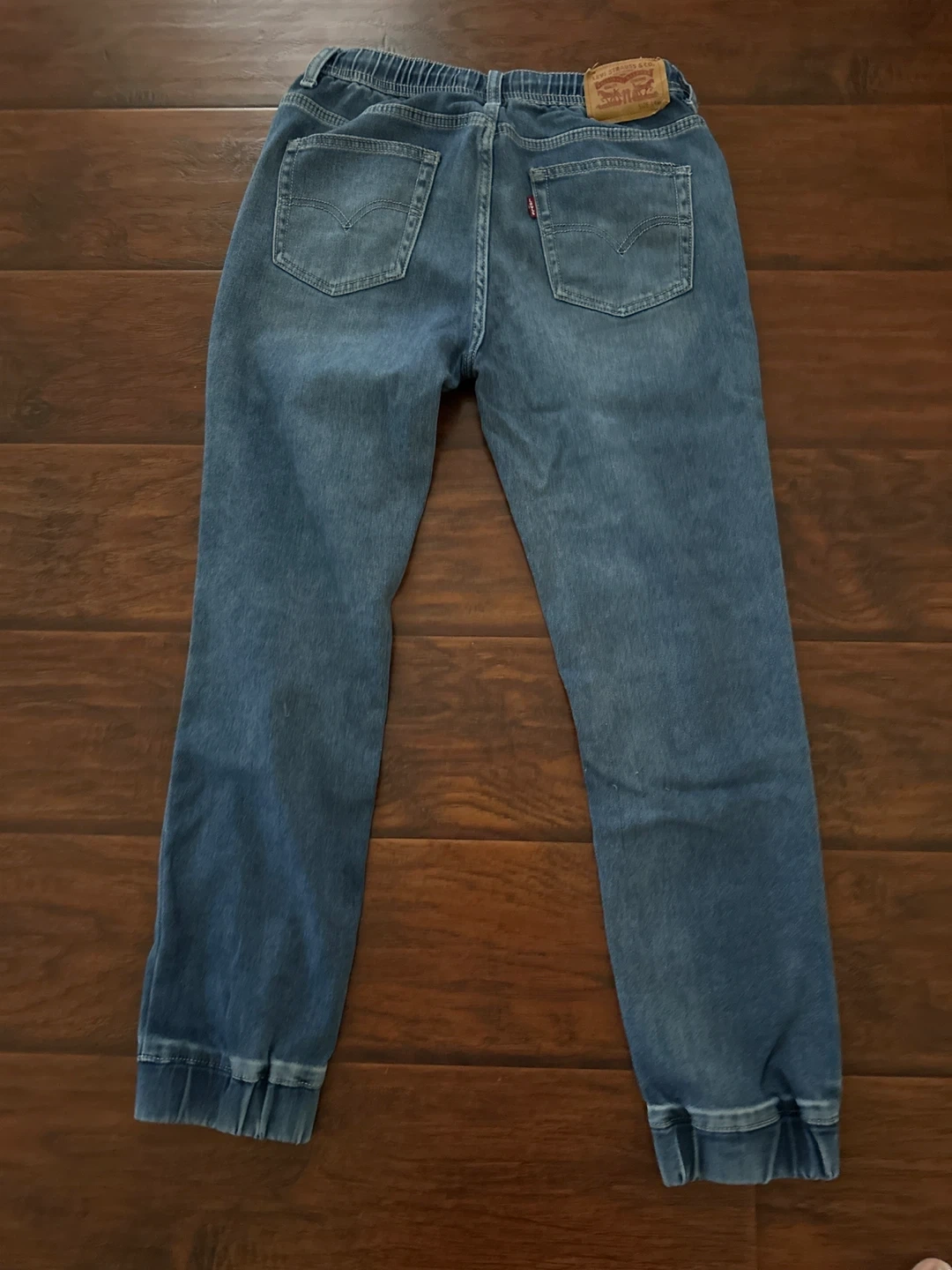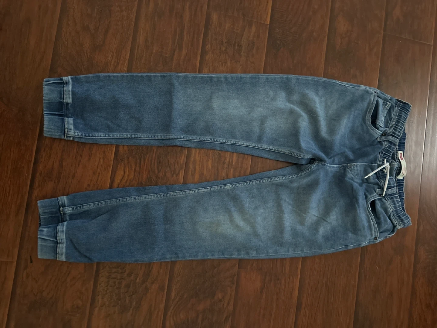 Levi's kids' jogger jeans in size 10 are up for grabs! These jeans feature a comfortable elastic waistband and jogger-style cuffs. They're in great condition and ready for a new home. Perfect for everyday wear!