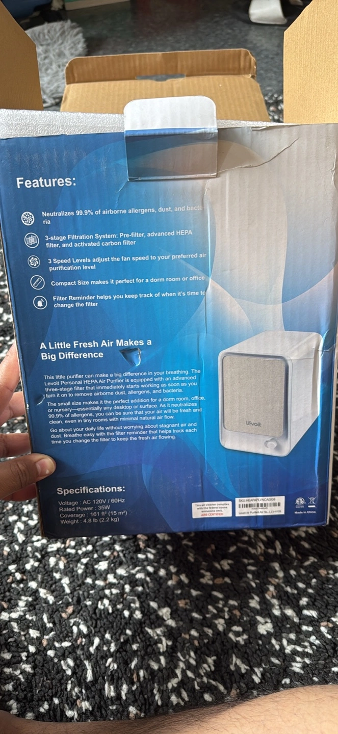 New Levoit LV-H126 Personal HEPA Air Purifier. Neutralizes 99.9% of airborne allergens, dust, and bacteria. Three-stage filtration system. Compact size, perfect for dorm rooms or offices. Three speed levels. Filter reminder.