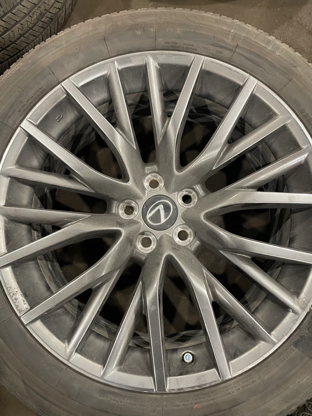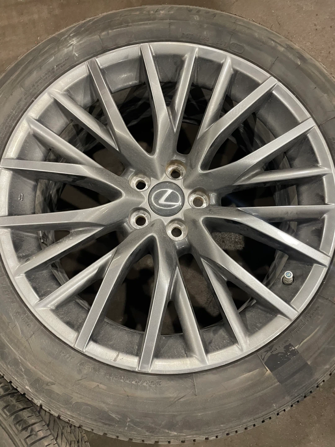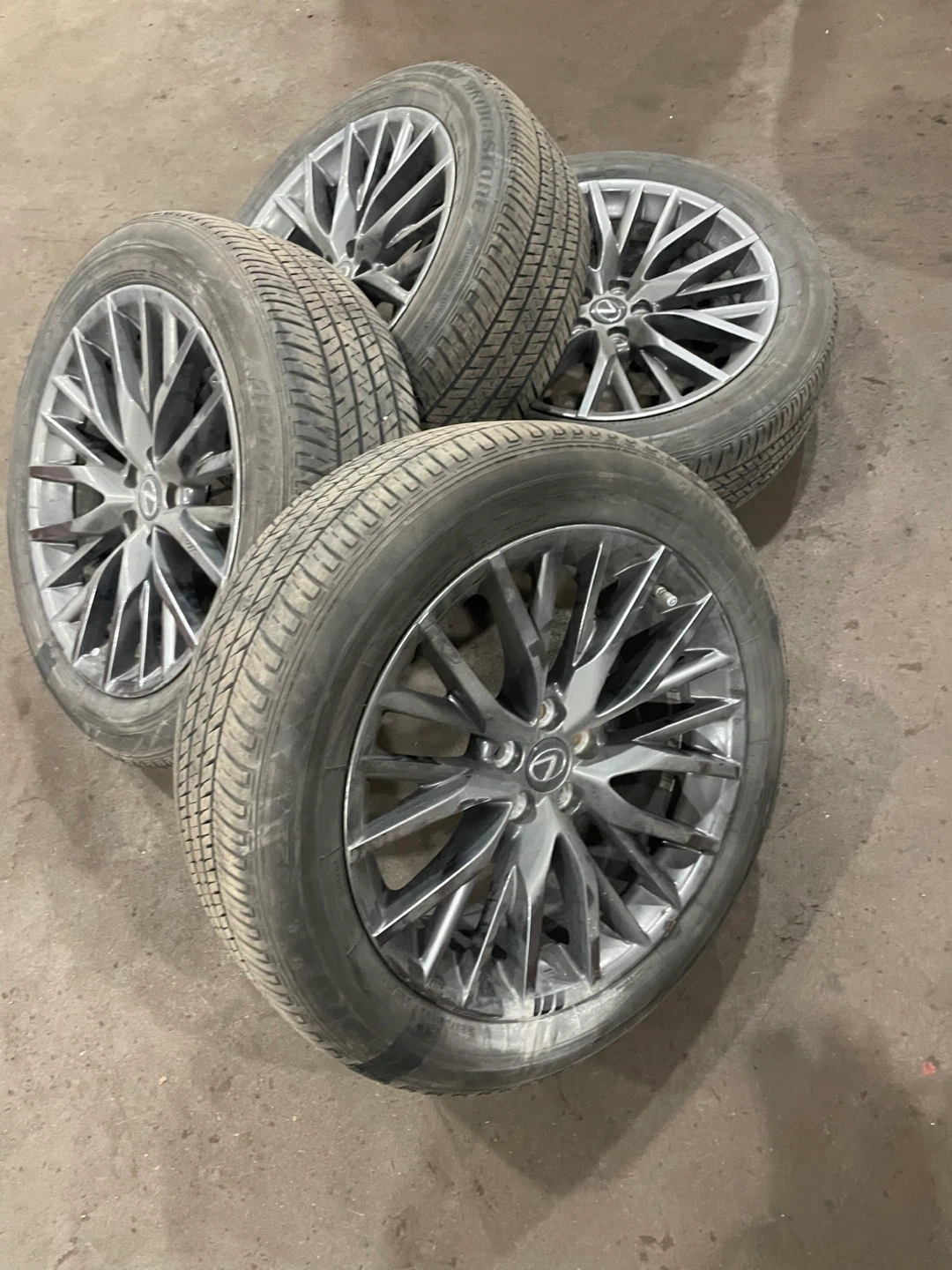 0Selling a set of four Lexus tires and rims. The tires are size 235/55R20 102V M+S. The rims have a Lexus logo on them. The tires appear to have some wear.