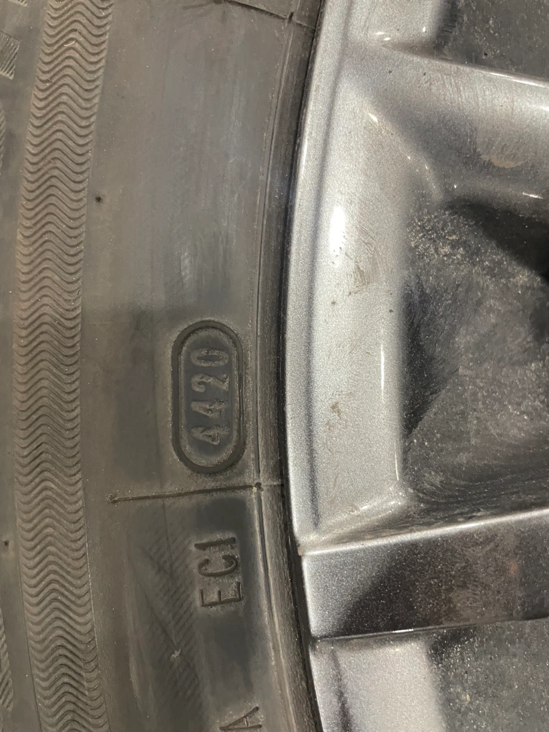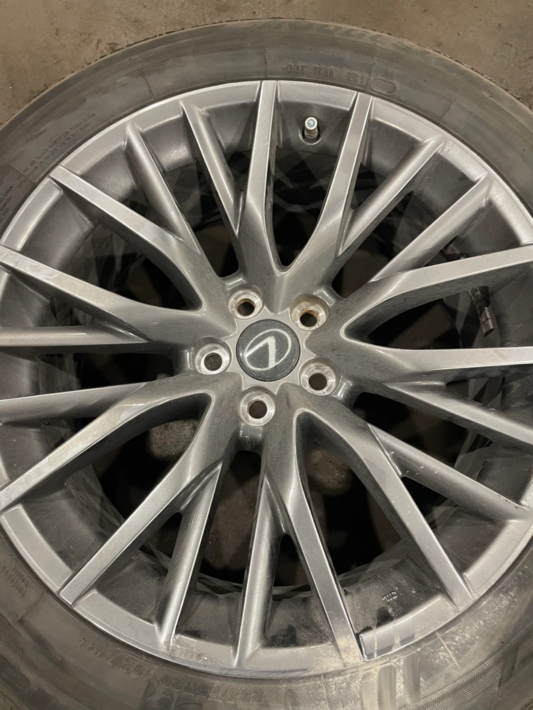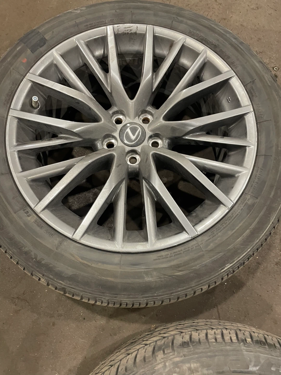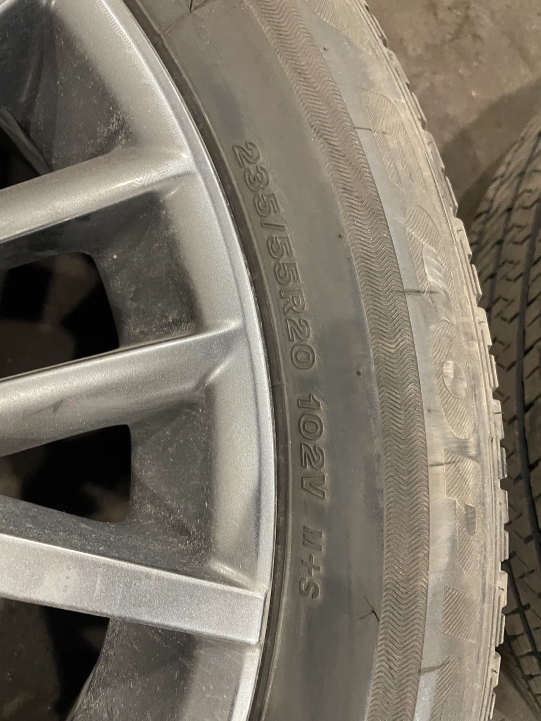 0Selling a set of four Lexus tires and rims. The tires are size 235/55R20 102V M+S. The rims have a Lexus logo on them. The tires appear to have some wear.